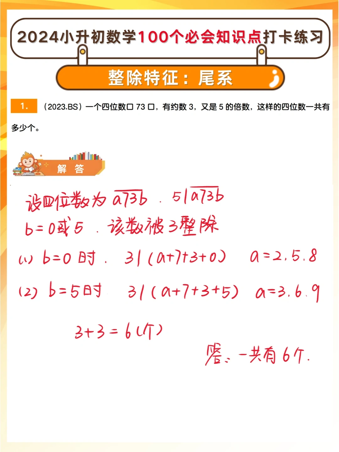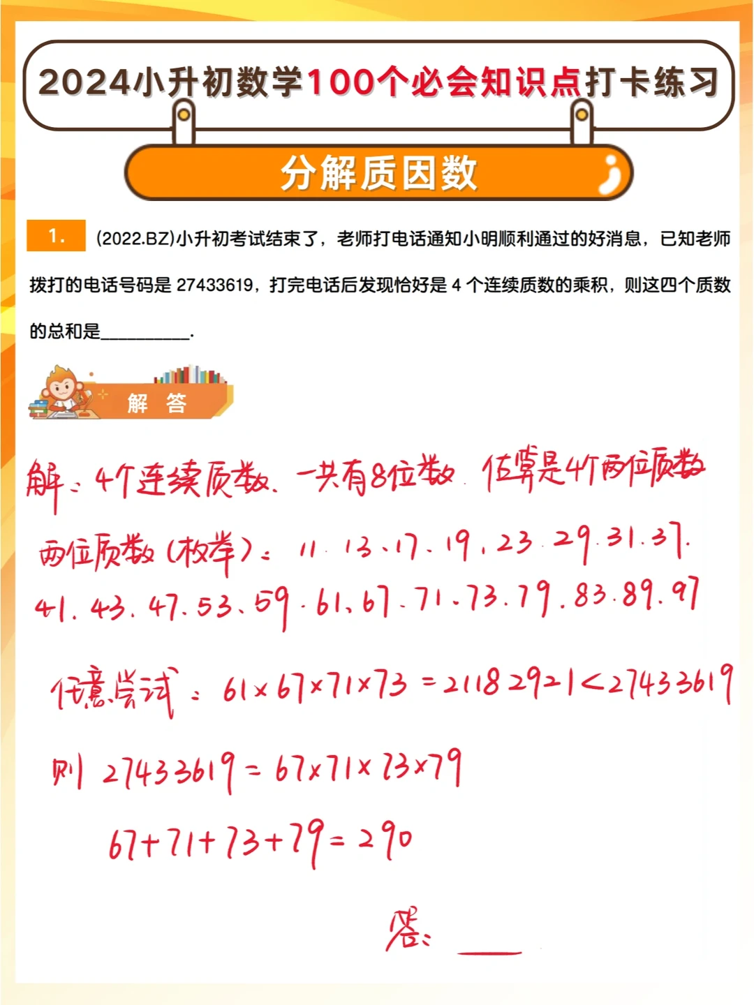 2024年重庆小升初数学100个必会知识点打卡练习(11-15) 1️⃣1️⃣流水行船 1️⃣2️⃣扶梯问题 1️⃣3️⃣整除特征:和系、差系 1️⃣4️⃣整除特征:尾系 1️⃣5️⃣分解质因数 数论部分的题有一定难度挑战,不知道孩子们掌握了多少❓