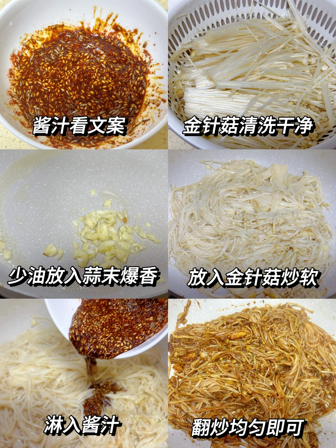 今天和大家分享这份孜然金针菇,低卡少油,好吃不胖~减肥期间也可以放心吃,可以吃出烧烤的味道,巨巨巨解馋,一大盘才100多大卡,喜欢的姐妹们快去试试呀~ 🥗食材:金针菇、大蒜、生抽、老抽、蚝油、白芝麻、孜然粒、辣椒粉 ✅酱汁:加1勺生抽➕少许老抽➕半勺蚝油➕1勺白芝麻➕1勺孜然粒➕1勺辣椒粉搅拌均匀备用 🥘步骤:如图所示~ 1️⃣金针菇去根洗净,控干水份撕成条备用。 2️⃣锅中倒油,爆香蒜未,倒入金针菇翻炒至没有水分 3️⃣锅中淋入酱汁,翻炒均匀开吃啦!