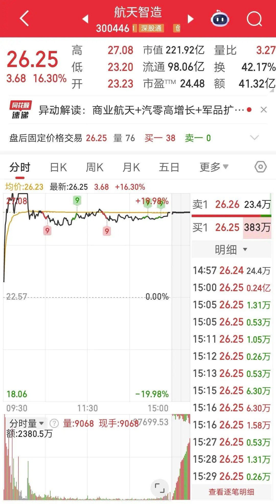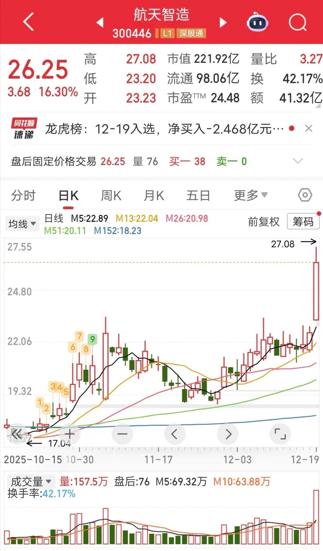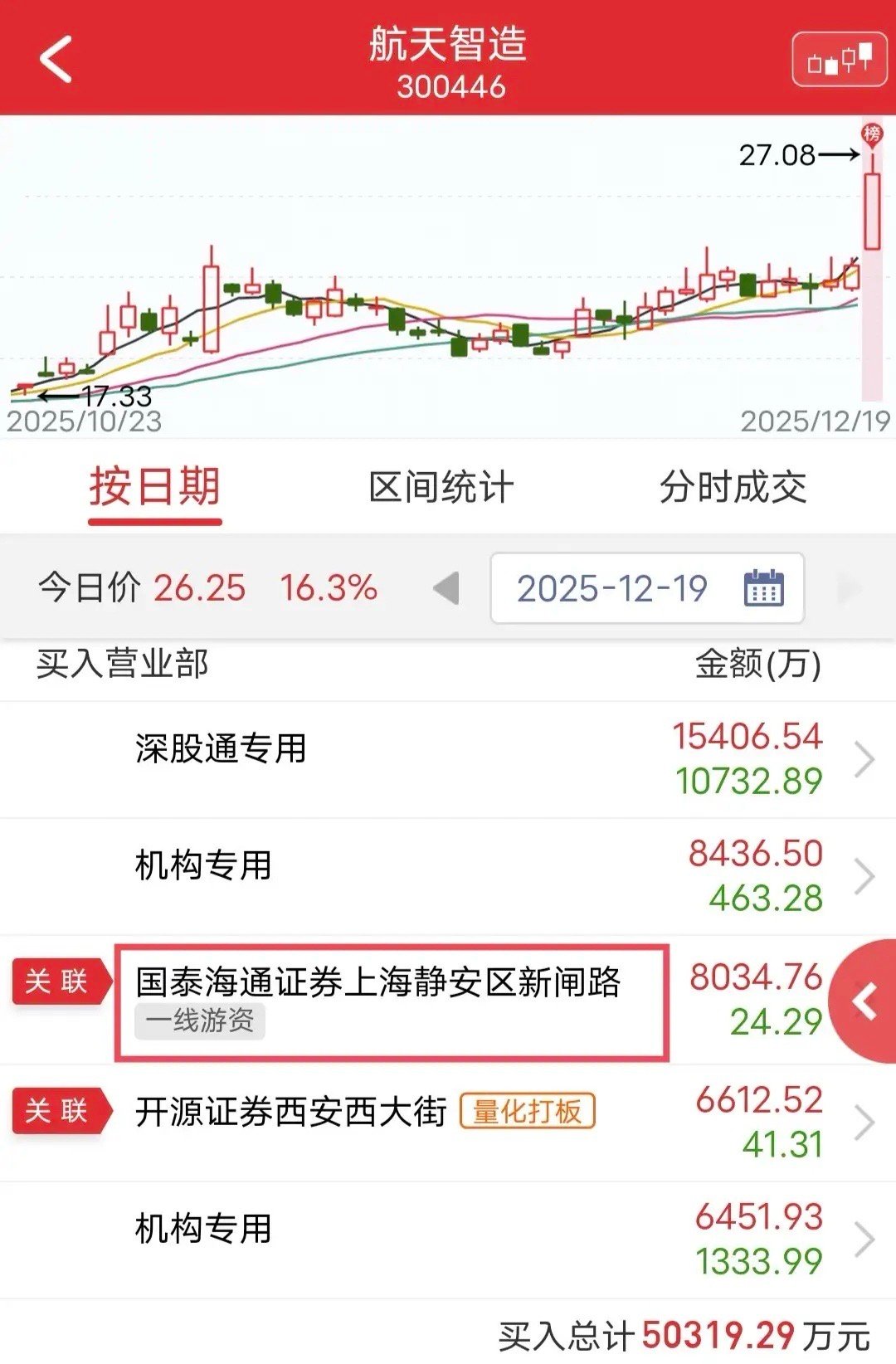 新闸路爆买8000万被砸:周五航天智造上板后被砸,最终未能封板。盘后龙虎榜显示,