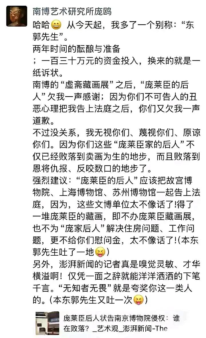 究竟谁是狼?谁是东郭先生? 庞鸥这话的意思怎么看都是在嘲讽庞家后人呀?