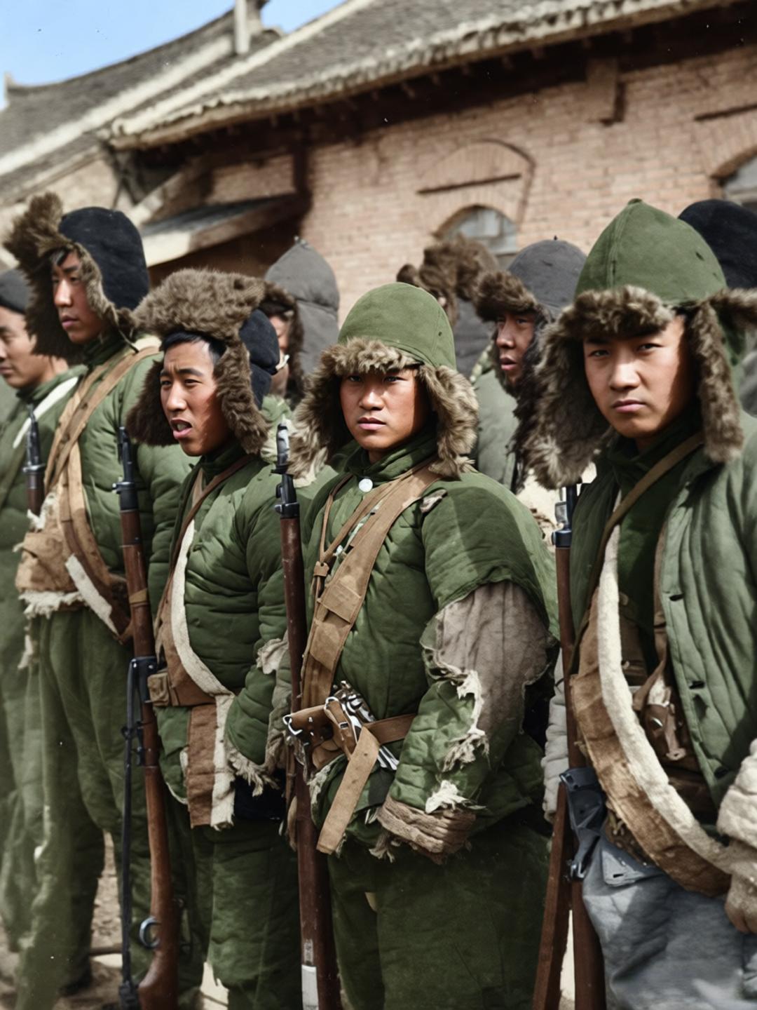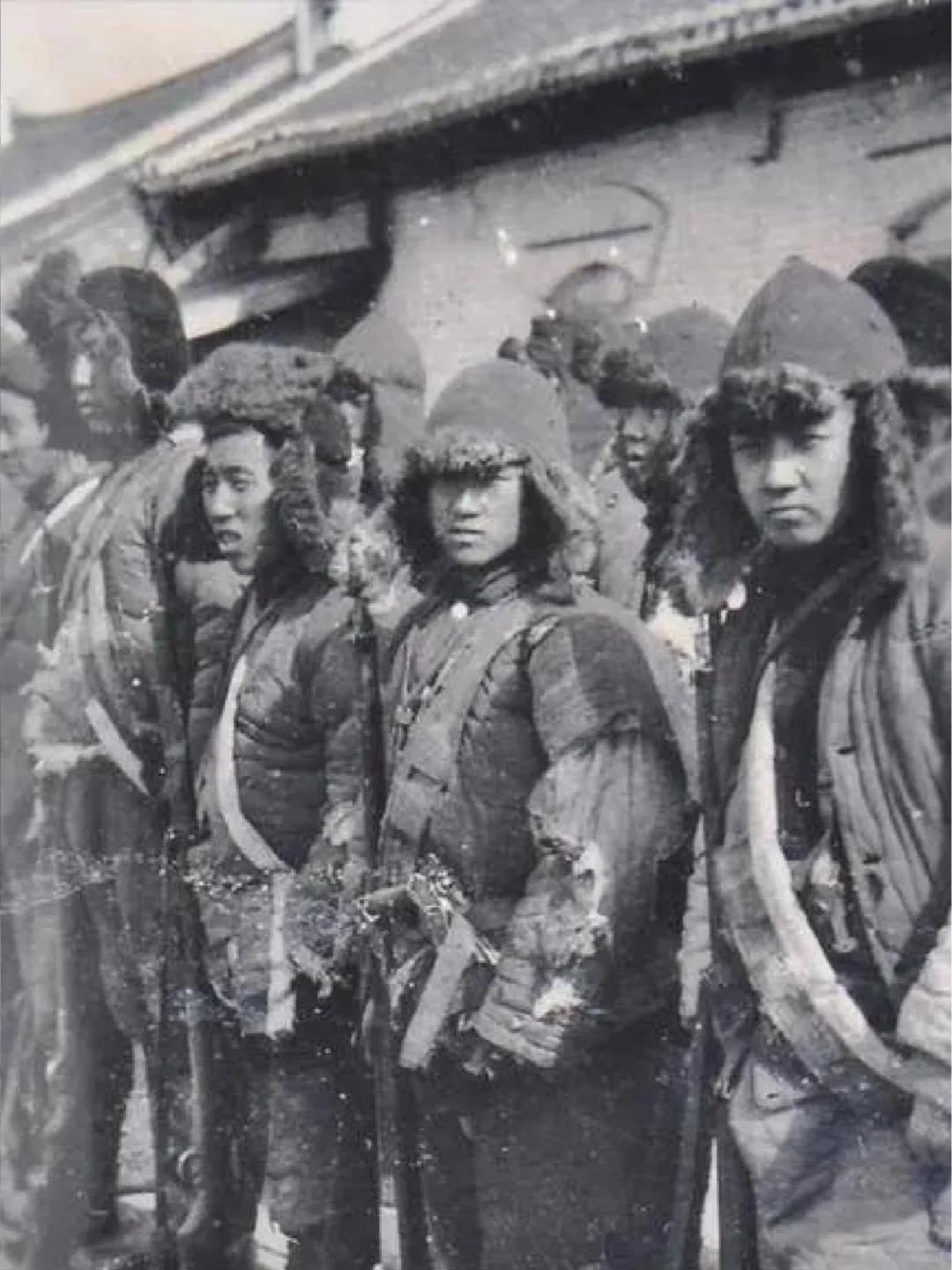 这是东北义勇军部队集结时的留影,战士们裹着破旧臃肿的棉服,头戴带毛边的防寒帽,衣物布满磨损痕迹,部分棉服甚至露出了絮状填充物;他们列队而立,神情凝重却透着不屈的韧劲,身上仅靠简单布带束着随身物品,装备简陋得近乎原始。 九一八事变后,东北民众自发组建的义勇军多由农民、矿工、原东北军散兵组成,既无统一后勤补给,也缺制式装备,只能靠简陋衣物抵御东北寒冬,却在极端艰苦的条件下坚持抗日,是早期东北抗日武装的核心力量之一。