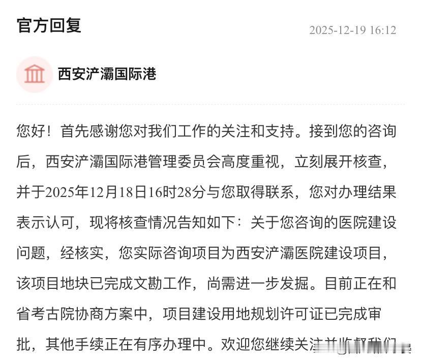 西安市第九医院(浐灞分院)是否还建设 市长您好,我是浐灞三路附近的居民,小孩生病住院都只能去市第三医院,浐河西岸前几年规划的西安市第九医院(浐灞分院)已经好多年了也还没有进展,请问下这个医院现在还建设吗? 官方回复 2025-12-19 16:12 西安浐灞国际港 您好!首先感谢您对我们工作的关注和支持。接到您的咨询后,西安浐灞国际港管理委员会高度重视,立刻展开核查,并于2025年12月18日16时28分与您取得联系,您对办理结果表示认可,现将核查情况告知如下:关于您咨询的医院建设问题,经核实,您实际咨询项目为西安浐灞医院建设项目,该项目地块已完成文勘工作,尚需进一步发掘。目前正在和省考古院协商方案中,项目建设用地规划许可证已完成审批,其他手续正在有序办理中。
