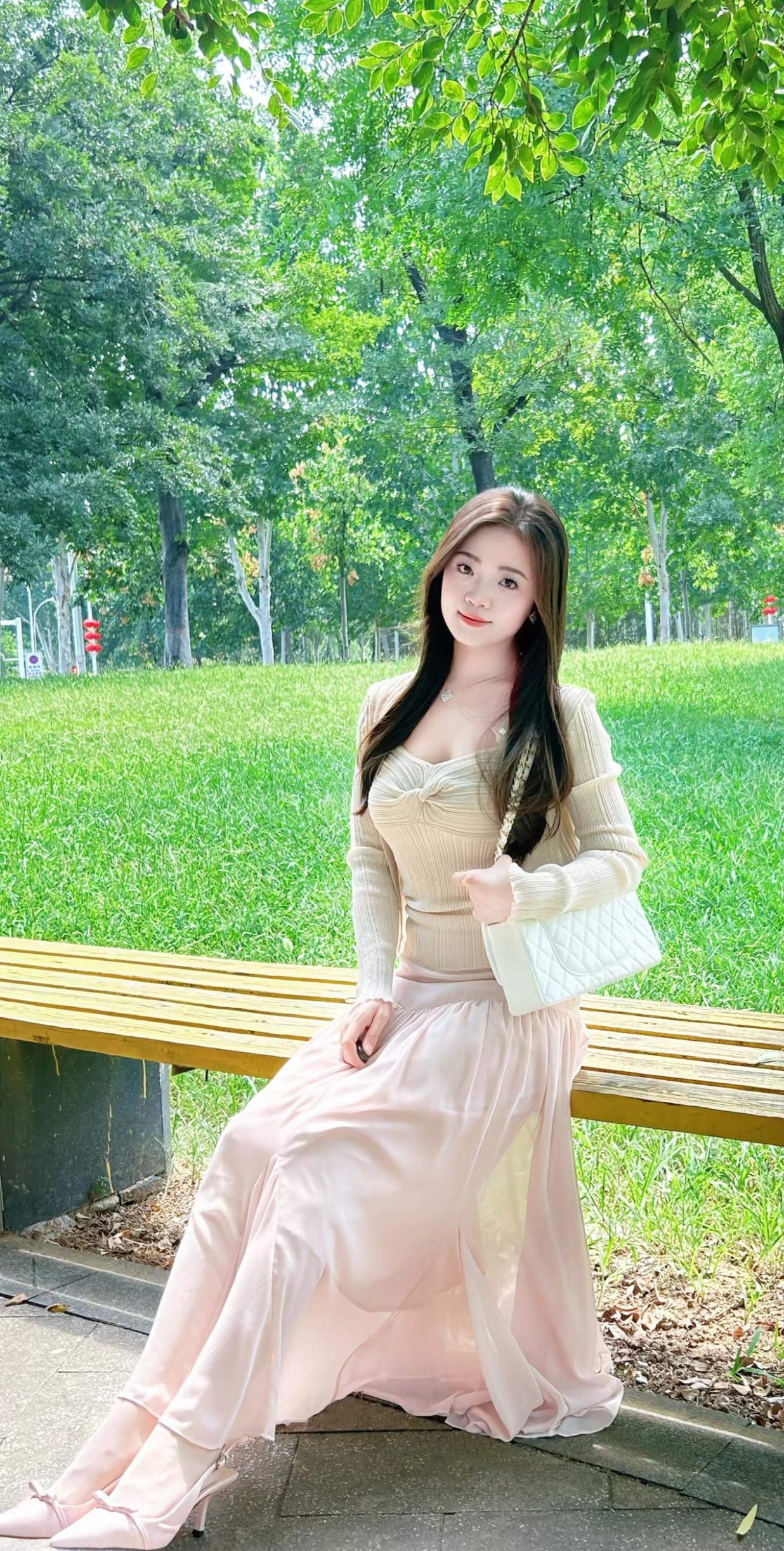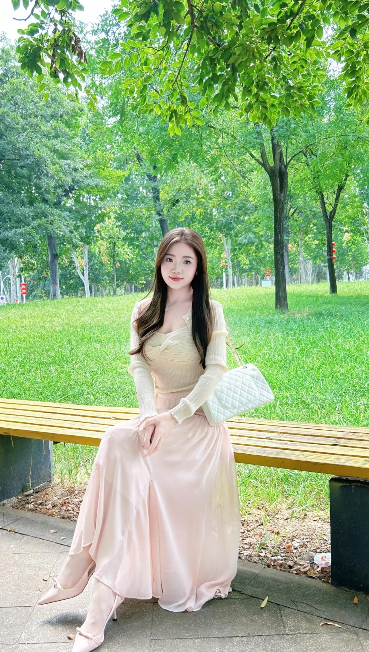 温柔粉色长裙,搭配米色毛衣,清新自然,享受阳光下的美好时光。