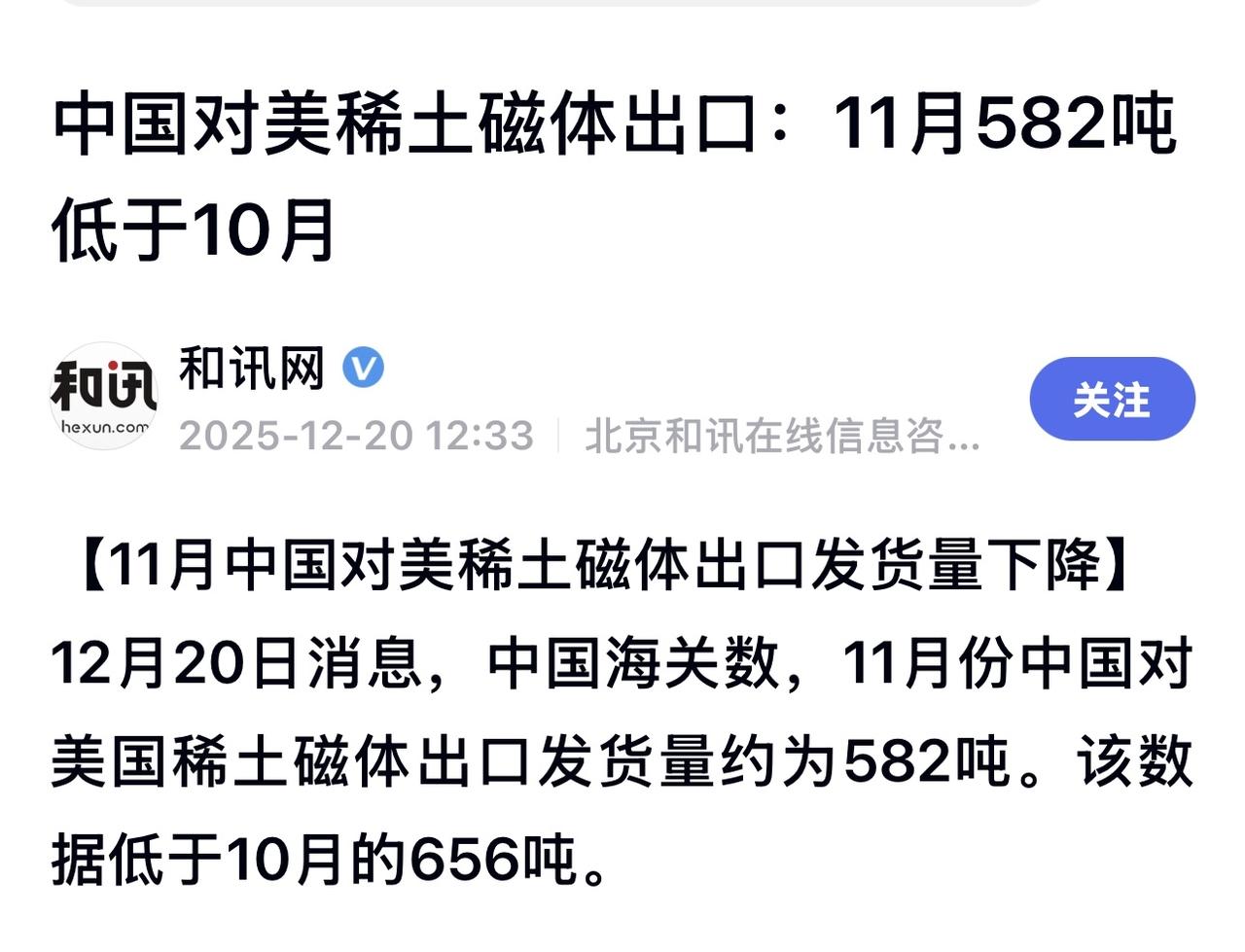 分析认为,虽然这类产品的交付没有迅速恢复到原来的规模,但中国的稀土磁体出口量在中美贸易战休战后已出现回升,并在最近几个月恢复到较为正常的水平。 稀土磁体广泛应用于电动汽车、军事装备等产品,中国今年4月和10月收紧对稀土的出口管制,随后一个月对美出口量骤降至不足50吨。