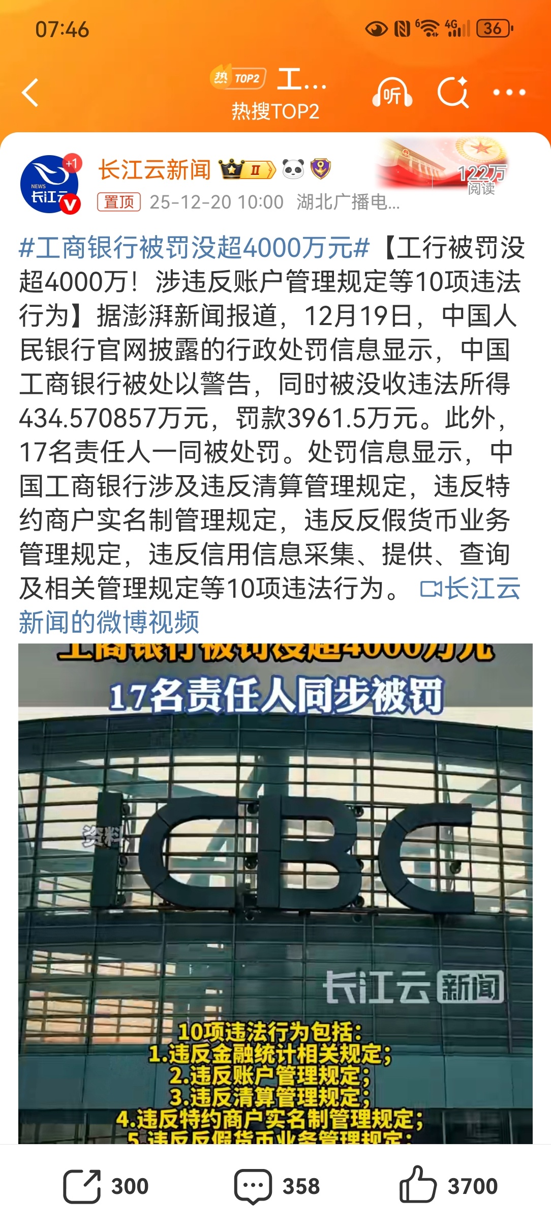 工商银行被罚没超4000万元工商银行因违反账户管理、清算管理、特约商户实名制、反假货币业务、信用信息采集等10项违法行为,被央行警告并罚没4396万元,17名责任人同步被罚。讽刺的是,这家"宇宙行"连最基本的反假货币规定都能违反,信用信息采集更是肆无忌惮。更可笑的是,工行回应称"问题均发生在2023年以前,已整改完毕"——两年多才查出问题,整改效率堪比蜗牛爬行。对年利润数千亿的工行来说,4000万罚款不过是九牛一毛,这种"罚酒三杯"式的处罚,能起到多少震慑作用?金融监管的牙齿,还需要更锋利些!全网热点共创计划