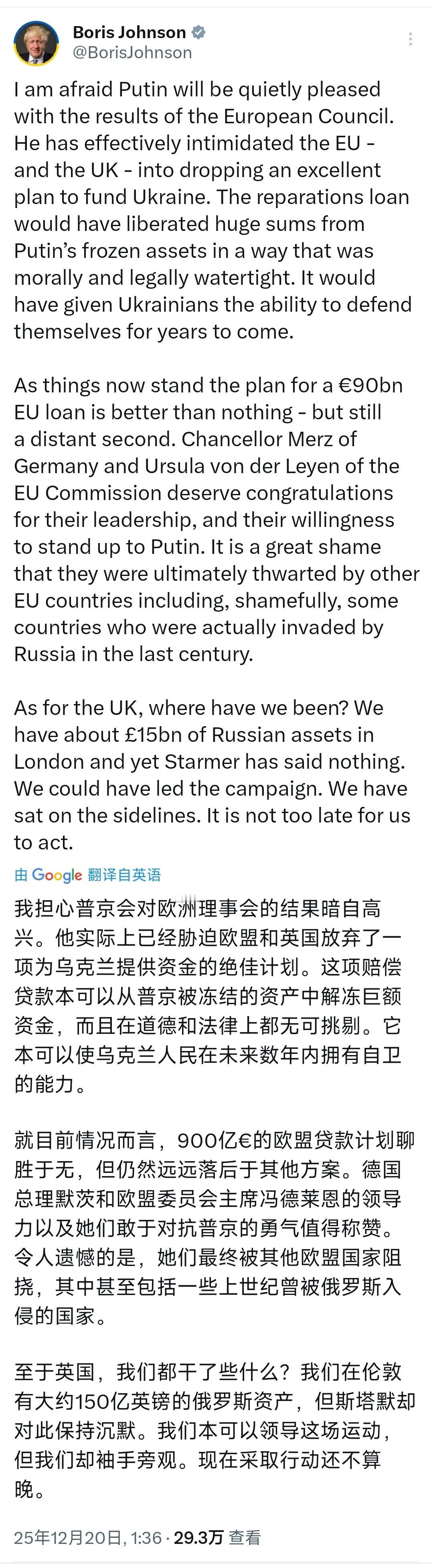 英国前首相鲍里斯·约翰逊12月20日发文写道:“我担心普京会对欧洲理事会的结果暗自高兴。他实际上已经胁迫欧盟和英国放弃了一项为乌克兰提供资金的绝佳计划。这项赔偿贷款本可以从普京被冻结的资产中解冻巨额资金,而且在道德和法律上都无可挑剔。它本可以使乌克兰人民在未来数年内拥有自卫的能力。” 这个据传闻俄乌爆发战争当年因收受了英国军工企100万英镑而极力“促成”俄乌最初谈判破裂,又在清楚知道美西方无法战胜俄罗斯,欧洲将会不可避免地继续受到他所说的来自俄罗斯的“威胁”的时候,聪明地从英国首相的座位上“临阵脱逃”一走了之的约翰逊,他怎么不在俄罗斯资产被冻结,他还是英国首相的时候第一时间就“勇敢”地做出他现在说的解冻普京的巨额资产这个“在道德和法律上都无可挑剔”的决定,而在现在指责英国其他政客是像他一样的草包?厚颜无耻。 更厚颜无耻的是他还说:“我们(英国)都干了些什么?我们在伦敦有大约150亿英镑的俄罗斯资产,但(英国首相)斯塔默却对此保持沉默。” 还是前面的话,在伦敦的150亿英镑的俄罗斯资产在他还是英国首相的时候就存在,他为了英国军工企的100万英镑宁可冒着被俄罗斯轰炸的风险出现在基辅的大街上,为什么也像他指责的斯塔默一样对俄罗斯的150亿英镑像现在的斯塔默一样“保持沉默”?说到底,他不敢,他和斯塔默一样没有敢惹怒俄罗斯胆量。 事实上,无论是从前的约翰逊还是现在特朗普斯塔默,它们的表现恰恰就是现在的二流国家——英国该有的标准表现。所以,约翰逊就别装了,一个二流国家跟在一流国家后面起哄可以,无论换了谁也不敢单挑俄罗斯;你不敢,你前面的不敢,你后面的也不敢。死心吧。