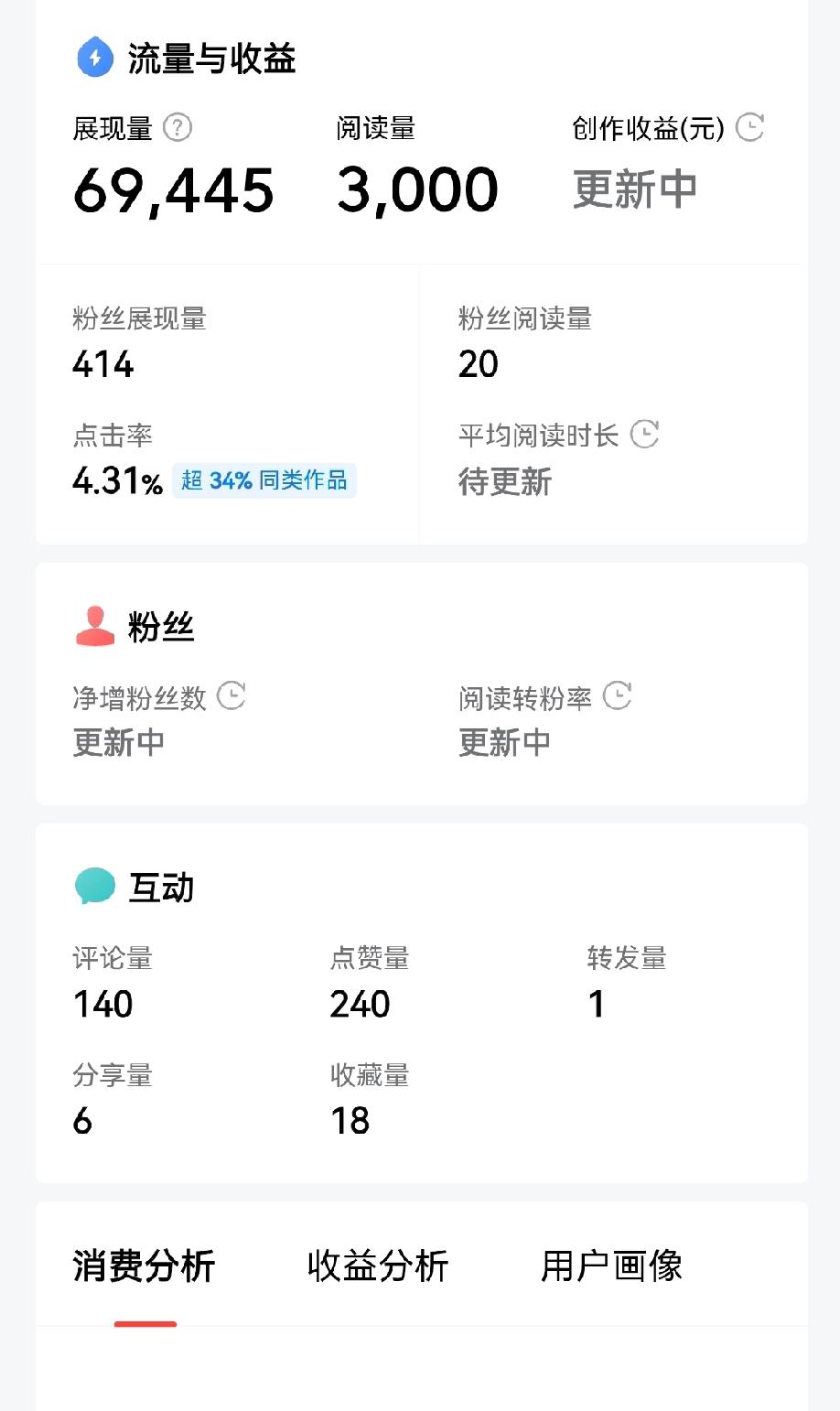 突然三重惊喜降临!原来头条还可以这样玩! 这两天有个意外发现,从头条激励任务框中去发文,头条会有流量扶持,遗憾的是每天只能发一篇。 我是两天前发现的,两天共发布了两篇微文,均小爆了一下,两篇微文头条一共给了14万多的展现量,好像还在慢慢的推。 我认为头条的本意不仅仅是给予14万的流量,头条还想给的还更多,无奈点击率数据不理想,一篇在3%、一篇在4%,接近推流的红线,越推越费力的地步了。 由于点击率不高,两篇微文的总阅读量只有五千多,但其中一篇的收益数据出来了,2千多一点的阅读量,头条给了3.85元的薪资,根据经验来判断,这里数据一直比较保守,实际上的收益可能会多一些,也就是说,这篇微文的单价可能不会低于2元。 而昨天的那一篇收益数据还没有出来,但昨日的那篇微文稍长一点,平均阅读时长也会多一些,所以其中的单价应该会在2元以上,这就是第二重惊喜!从激励任务栏中发文、阅读单价会比较高。 第三重惊喜就是明面上的了,一篇微文100加油包,两篇就是200加油包已进入了我的账号。 从激励任务栏中去发文、有流量扶持,前面的一篇微文中我已经提到过,那篇微文也是爆款,获知信息的友友也比较多,相信友友已经从那里去发文了,但还没有收到喜讯! 不知友友们的情况如何?但有一点是可以肯定的,加油包他们一定是收到了,至少友友们去一趟也不会空手而归吧!