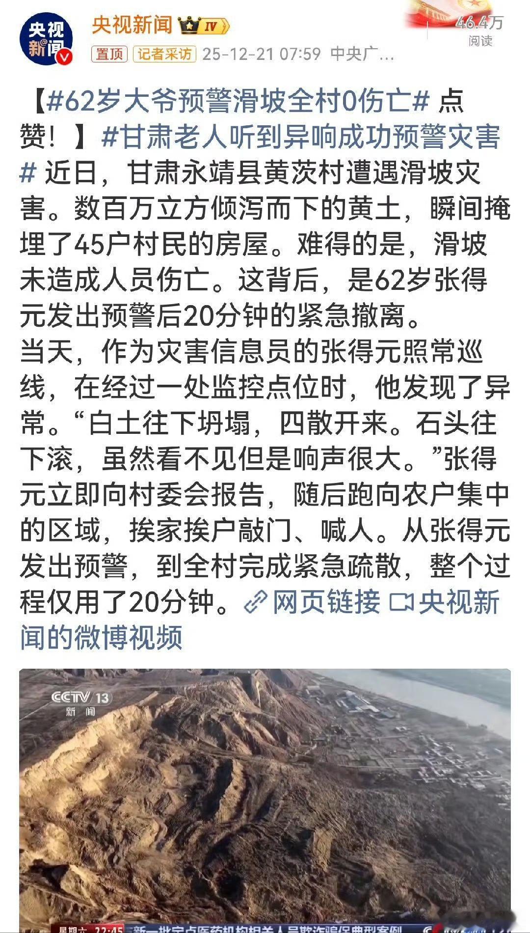 滑坡全村零伤亡的背面,是62岁的大爷张得元,普通的岗位上20年日复一日刻进骨子里的坚守! 62岁的张得元,只是甘肃省临夏州永靖县盐锅峡镇黄茨村一名再普通不过的村镇级灾害信息员。 12月10日,张大爷日常巡逻时听到山体异响、望见坡顶尘土飞扬,他瞬间警觉,立刻上报、挨家挨户敲门呼喊。20分钟,378名村民全部转移! 在我看来,张得元大爷创造的零伤亡奇迹,从来不是什么天降好运,而是一个基层灾害信息员最硬核的坚守,是岁月沉淀下来的专业与担当。 他没有高精尖的监测设备,靠的就是三年如一日、每日两次雷打不动的巡查脚步,是20年前滑坡惨剧刻在骨子里的警觉。听到异响的那一刻,他没有丝毫犹豫,上报、敲门、嘶吼,20分钟跑遍全村,硬是把378条人命从滑坡边缘拽了回来。 当677万立方米的山体轰然砸向村庄,房屋耕地化为废墟,却无一人伤亡——这就是基层“生命哨兵”的力量! 总有人说这些村镇岗位平凡,可我偏觉得,这份平凡里藏着最了不起的伟大。那些觉得“基层工作没技术含量”的人,根本不懂这种日复一日的坚守有多可贵。正是这些守在防灾一线的普通人,才是咱们老百姓最踏实的靠山。他们用看似琐碎的日常,撑起了千万家庭的平安防线,他们才是真正的无名英雄!