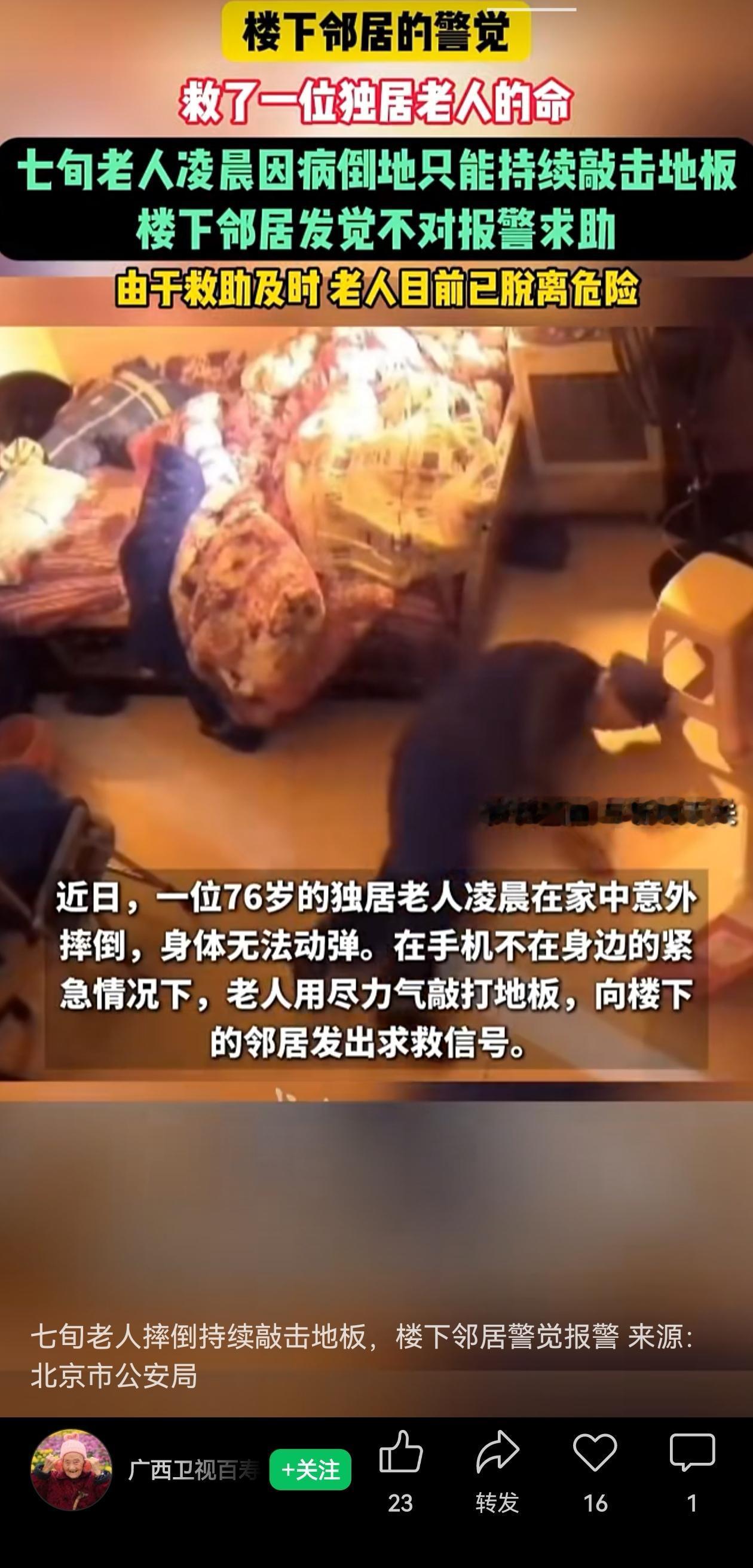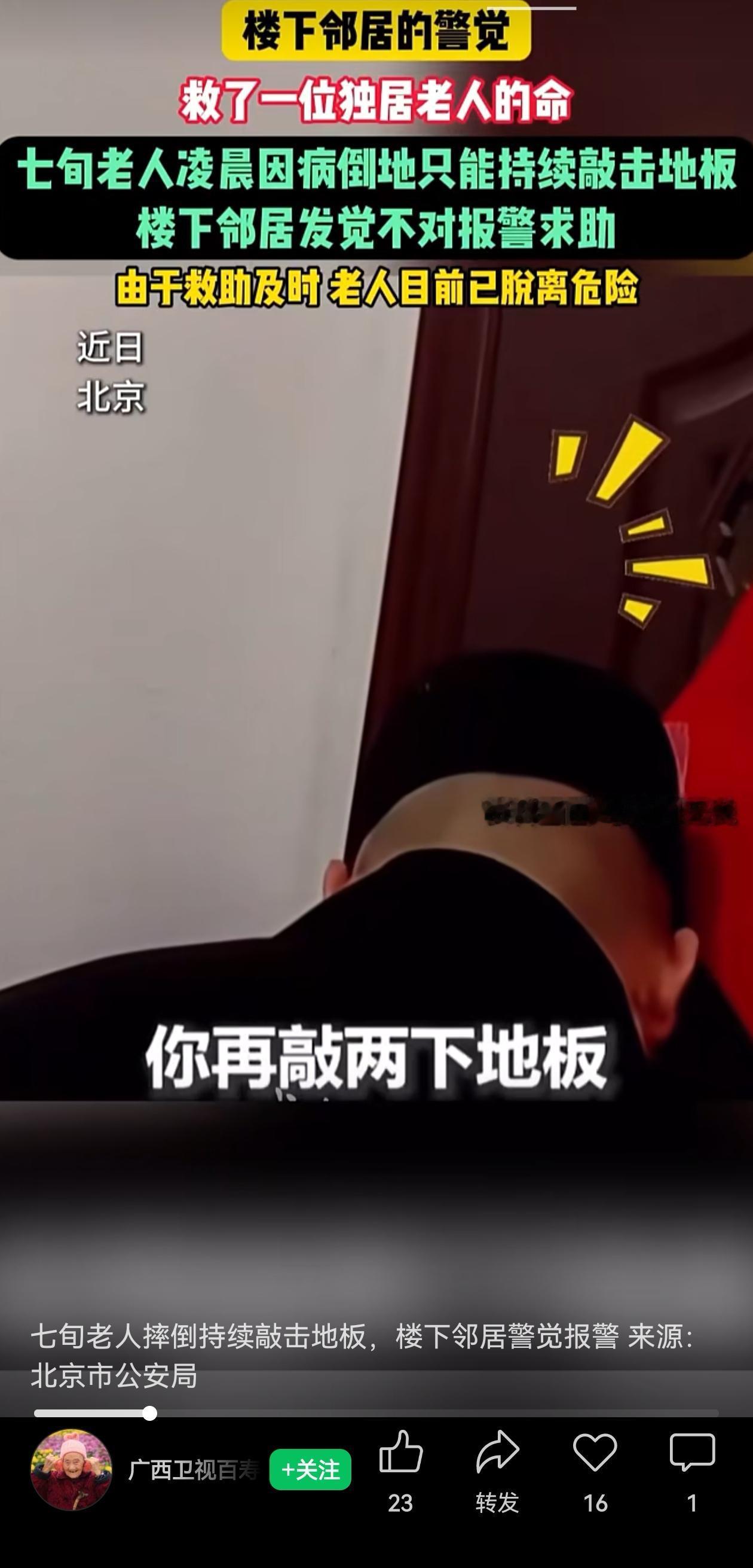 这样都能懂?北京一位76岁的独居老阿姨,凌晨突然发病摔倒在地上,动都动不了。那时候天还黑着,整栋楼静悄悄的,她连喊的力气都没了,手机又不在身边,倒地后根本够不到! 老人只能用手指一下一下敲地板。楼下的邻居半夜被“咚、咚”的声音弄醒,听到声音觉得不对劲,上楼敲门大喊:“阿姨,你要是有危险的话,你再敲两下地板”! 果然听到有断续的敲地声。邻居立马报警,警察和救护车不到一刻钟就赶到了。撬开门一看,老人已经瘫在地上,意识都模糊了。 幸好送医及时,捡回一条命。 俗话说“远亲不如近邻”。老人独居,儿女不在身边,夜里这么危险的时刻,万幸遇上个警觉的好邻居。 敲地板的声音多轻啊,换个人可能翻个身又睡了。可正是这份“多管闲事”的细心,救了老人一条命。 独居老人的痛,是疼到眼前发黑,却连伸手够手机的力气都没有。最痛的不是病,不是老,而是在最需要搭把手的时候,身边空无一人。 那“咚、咚”的敲击声,敲在地板上,也敲在所有人心上! 那两声“咚咚”,在深夜里,普通人听来可能就是烦人的噪音,但是这位好邻居能听出老人尽全力的求救信号。 所以说,老人运气好,更重要是人心好。这份邻里间下意识的警觉和毫不犹豫的伸手,比什么都珍贵。 为这样的好邻居点一万个赞!真正的“近邻”,不是住得近,而是心听得见。听得懂了那两声地板上传出的“咚咚”声…… 信息来源:广西卫视百寿探秘