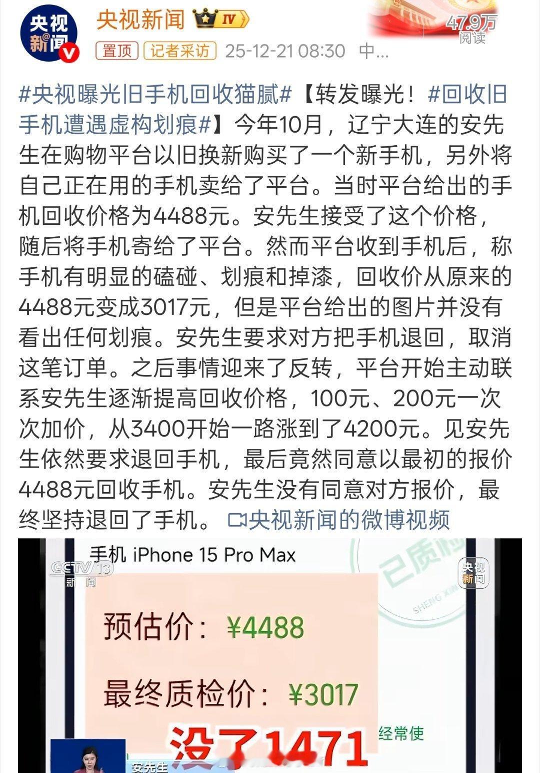央视曝光旧手机回收猫腻看到央视曝光的旧手机回收乱象,有时候真的蛮无奈的,明明奔着靠谱去的,硬是被一些不良商家,做成了“欺诈游戏”,利用信息差恶意压价,不仅坑了消费者的钱,还伤了大家的心!作为普通用户,我们能做的就是:1️⃣擦亮眼睛选大平台或官方渠道;2️⃣留存证据保护自己;3️⃣遇到不公坚决投诉,不惯着坏毛病;希望行业能规范一点,让我们卖个旧手机也能安安心心的