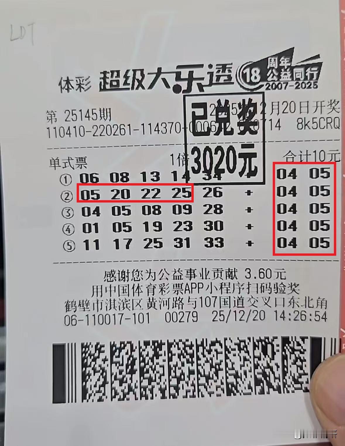今日冬至,首先祝大家所有美好,都能如期而至。 大乐透最令人唏嘘的莫过于四等奖了——同样是命中6个号码,奖金却仅有3000元。12月20日开奖的大乐透25145期,河南一位彩民就遭遇了这般"甜蜜的遗憾"。有意思的是,这位彩民采用单式5注投注方式,前区号码全部机选,唯独后区04+05是自选,足见其对这组号码的笃定。 最终,这份"独宠"为他带来了3020元的回报。虽然与大奖失之交臂,但超300倍的回报率也算不负所望,为这个冬至平添了一份温暖的惊喜。