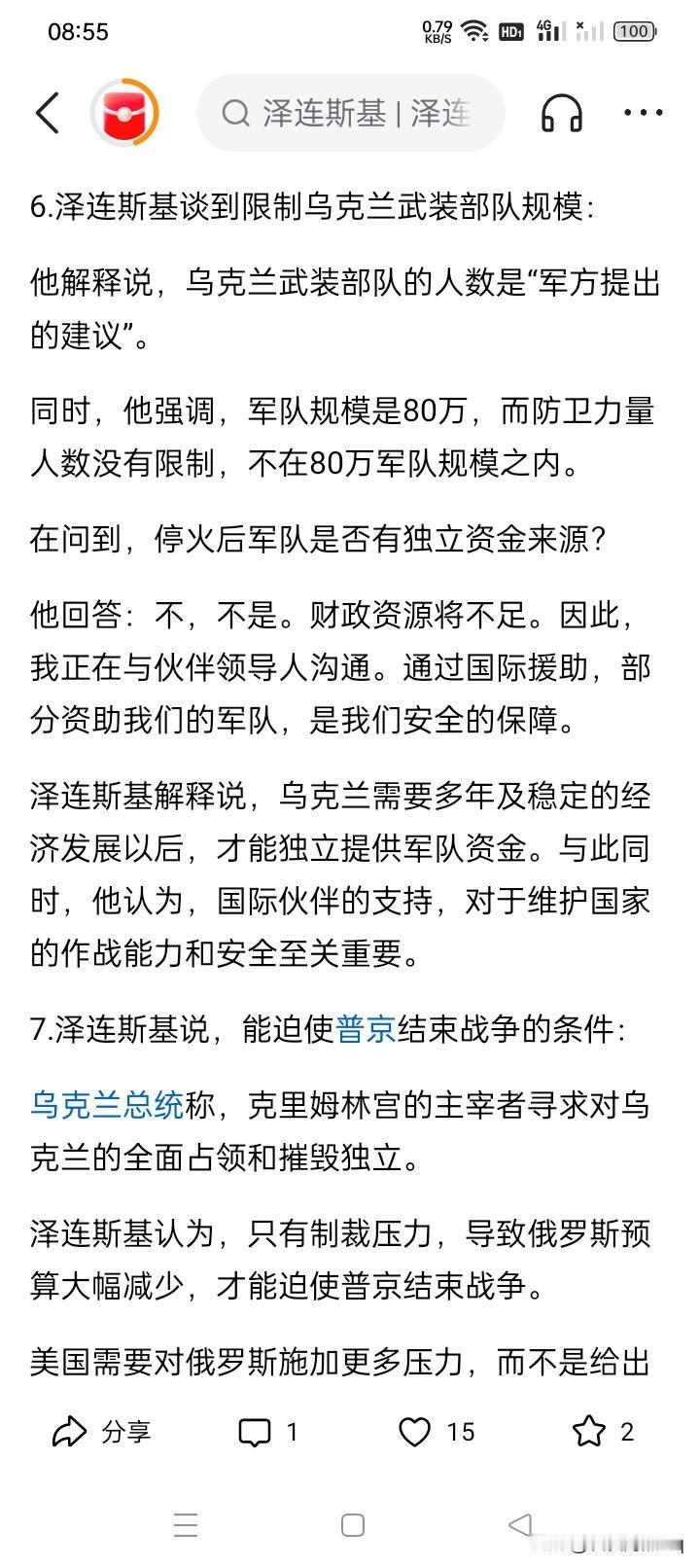 原来80万军队是这样来的! 乌克兰在与美国就乌克兰战争停火、并签署和平协议后,关于乌克兰保留的军队规模方面,规定是乌克兰只能保留80万士兵。实际上,一个国家不管是保留、或者拥有军队的数量,应该说是这个国家自己主权内政的事情,但乌克兰为什么就答应了保留80万军队规模的规定? 乌克兰总统泽连斯基对此作出了解释:首先是军队的意思,大概军队的高层军官认为,80万军队的规模已经够了,也就是这个要求。第二个却是最重要的,那就是这80万军队中,并不包括防守的部队数量,也似乎就是说,这80万的军队,全部是机动部队,用于防守的部队不在其内。 那么,防守部队拥有多少数量呢,当然没有任何限制。如果真的是这样,即便是全世界的人中,又能有多少人可以严格、明确划分出来机动军队与防守军队的区别呢?大概很难找出来几个。 因此,估计可以认真的说,费尽心思搞出来的限制乌克兰保留80万军队的条款,实际上不过就是一个文字游戏,对限制乌克兰的军事力量,很可能根本就没有任何意义。因此,乌克兰才同意这个要求。