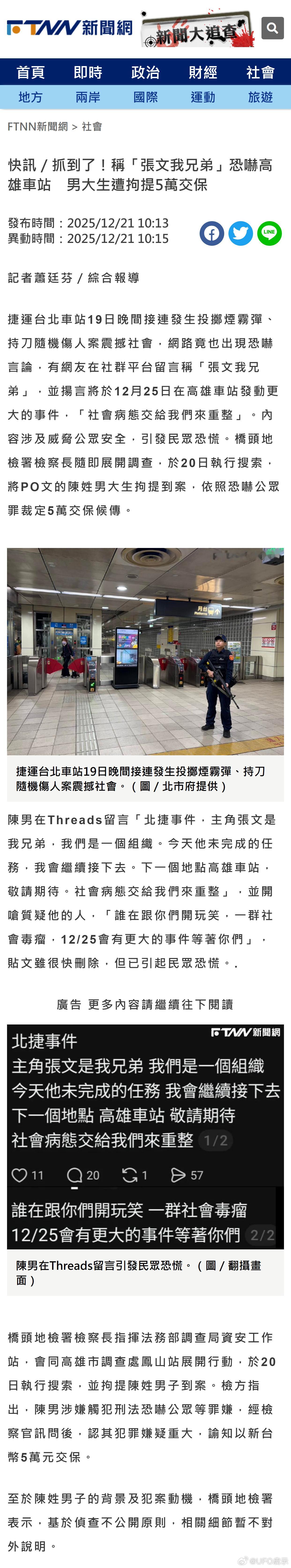 台媒:抓到了!称「张文我兄弟」恐吓高雄车站 男大生遭拘提5万交保
