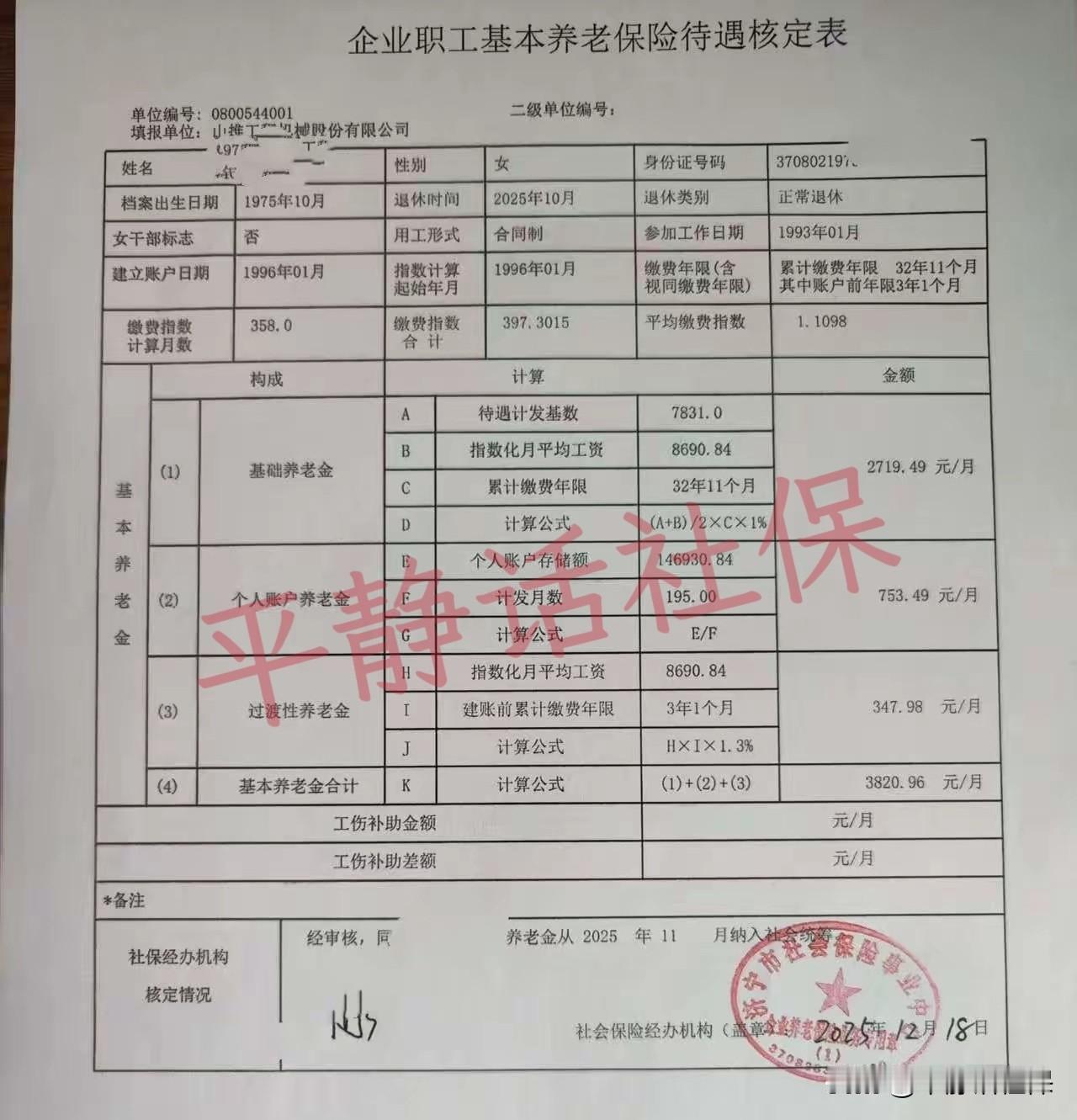 山东养老金! 女性,75年10月生人,25年10月退休,缴费32年11个月,退休年龄50岁,个账14.69万,指数1.1098 基础养老金2719.49元 个账养老金753.49元 过渡性养老金347.98元, 合计3820.96元,平均工龄单价119元/年,从2025年11月开始领取。 山东省的统账时间省内并不统一,本案例统帐时间为1996年1月。案例主人公累计缴费32年11个月,参加工作时间为93年1月。 本案例有一个比较想不通的地方,就是累计缴费年限32年11个月。如果参加工作为1993年1月,退休为2025年10月。满打满算应该是32年10个月,不知道这多出来的1个月是什么? 并且这多出来的一个月是统账之前的,从表格中可以看出来,统帐之前的缴费年限是三年1个月,93年1月到95年12月,难道不是3年吗? 友友们知道这1个月是什么原因吗?