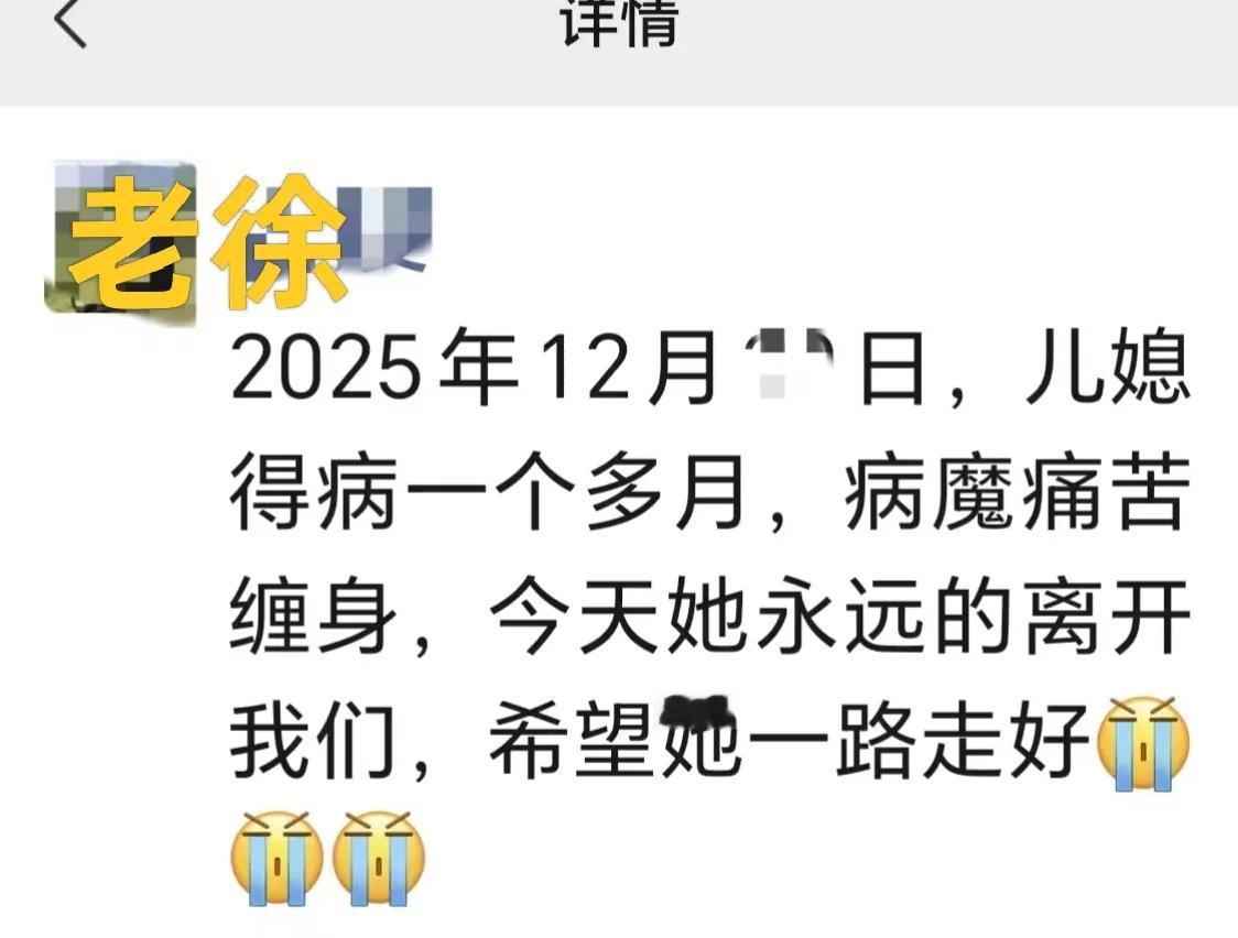 前天晚上战友老徐发个朋友圈,让我们大伙惊讶。36岁儿媳妇患病折腾几个月走了。太年轻了。 好像是四年前,老徐说他儿子跟儿媳妇开了家面馆,让我们过去品尝品尝。我们就过去了,儿媳妇挺苗条漂亮的,也挺热情,亲自给我们煮面,上小拌菜,拿啤酒。 老徐国企一个小干部退休,脑子灵活,这些年销售企业的东西,顺手牵羊也卖自己的东西。赚了点钱。 儿子没上过大学,高中毕业一直打工,前些年去了长春战友企业,干几个月不干了,又跟媳妇开面馆,面馆也赔钱了。 三年前跟人家集资想发财,结果扔进去200多万债务。自己把他老爸给买的婚房150多万卖掉抵债了。老徐又给拿了50多万。儿子债务还完了,老徐耳朵聋了。现在听不见人们正常说话,交流靠微信上手写。 儿媳妇具体啥病,我们也不知道,不好意思打听。 正常战友家老人没有了,我们战友在跟前的都去火葬场送送。不在家的表示一下意思。 老徐儿媳妇没有了,老徐任何人也没有告诉,但是有战友看到他前天还在饭店喝酒。 大伙有点不会了,不知道是去参加葬礼好,好是就当不知道了。 关键是,老徐只发了一个朋友圈。