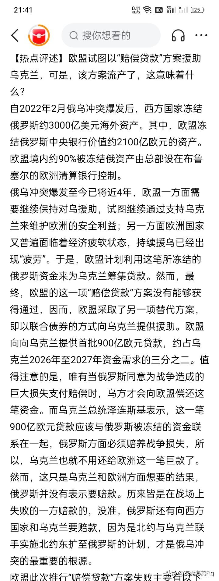 天大好事? 如果因为种种原因,欧盟在不能够按原计划动用冻结俄罗斯的资产去向乌克兰提供资金援助的情况下,却并没有放弃,宁愿自己去贷款也要去援助乌克兰。这说明了什么?至少说明了他们对向乌克兰提供资金援助这件事,有着高度的重视和充分、必要的认识,才有可能做到这一点。 然而,令人费解的是,竟然有人说这是欧盟委员会主席冯德莱恩的失败,又是德国总理默茨的失败等等,似乎纯属求全责备,甚至好像完全是吹毛求疵,百般刁难。 实际上,乌克兰现在进行的抵抗战争,完全不是过去那种缺粮少弹,捉襟见肘,过了今天、不管明天的事情的那种战争,尤其是那种我们熟知的、习以为常的游击战的战争,而是有计划、有预算、有差不多充分准备的抵抗战争。 特别是,冻结的资产不过仅仅只是没有使用,但却并没有消失,以后条件成熟,当然还可以用。