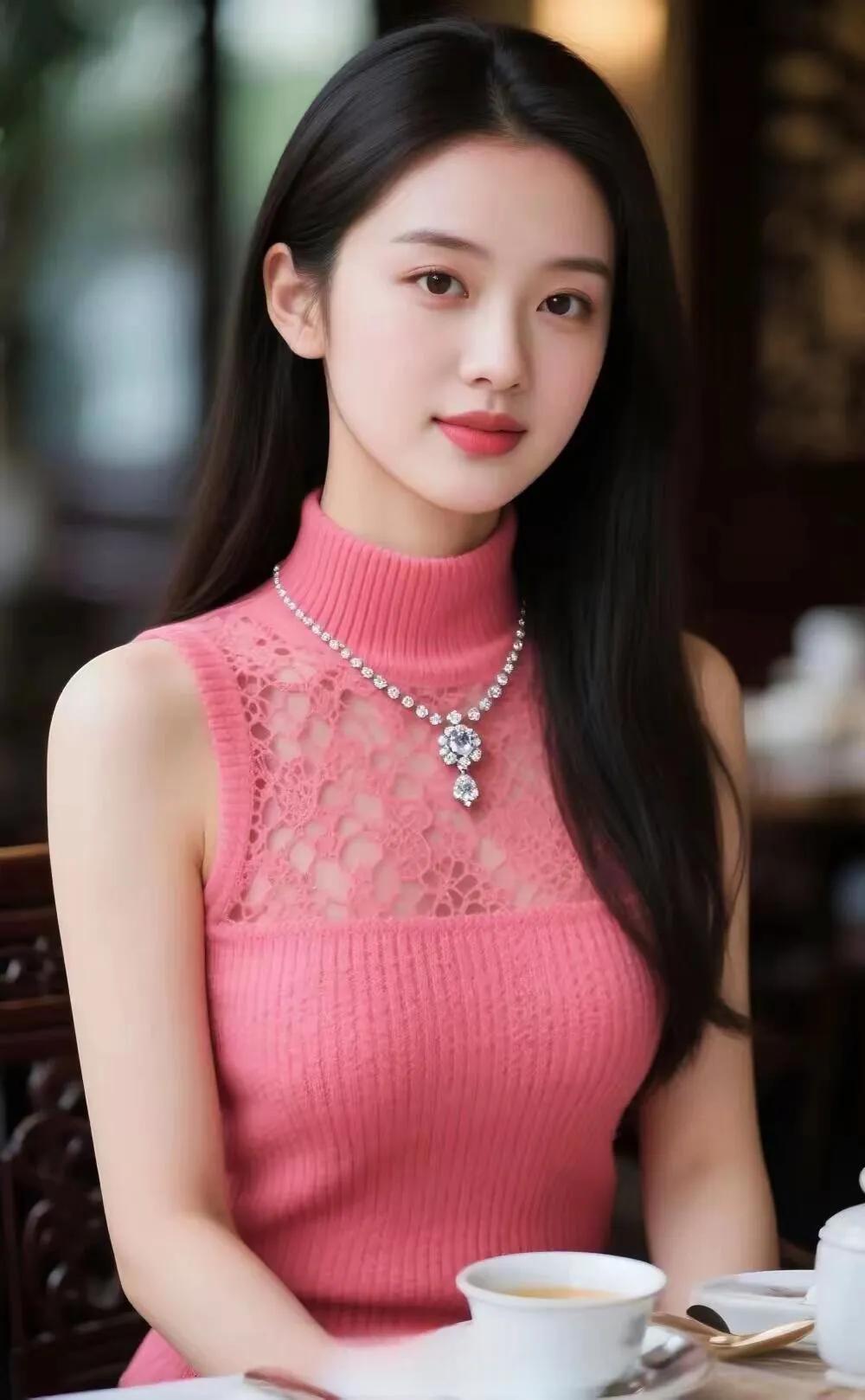 优雅咖啡时光,粉色蕾丝连衣裙,精致项链,享受宁静午后。