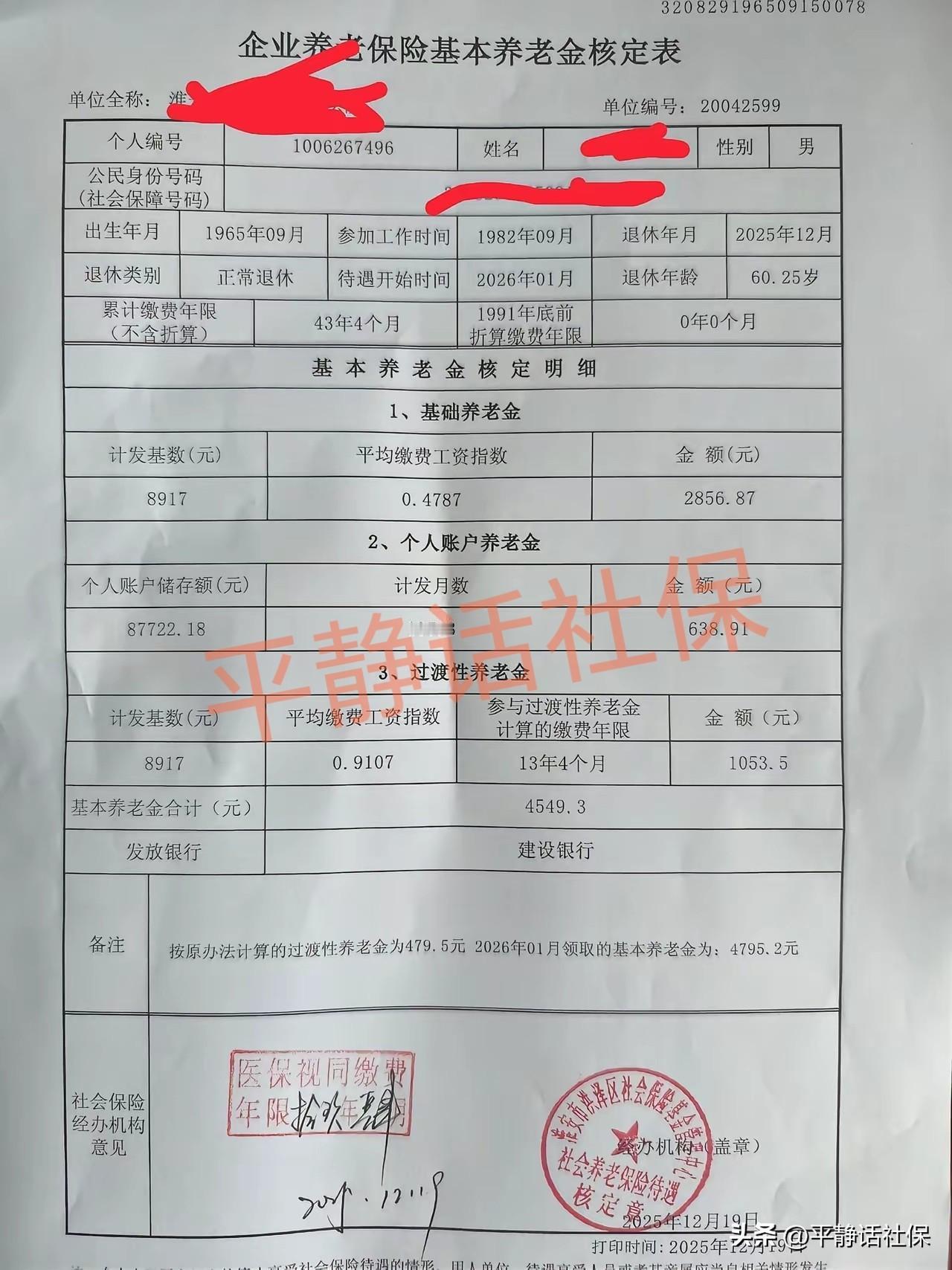 江苏养老金! 江苏男性参保人,1965年9月出生,1982年9月参加工作,2025年办理退休,退休年龄60周岁3个月。累计缴费年限43年4个月,个人账户余额8.77万元,基础养老金缴费指数0.4787,过渡性养老金缴费指数0.9107。 核算退休养老金: 基础养老金2856.87元 个人账户养老金638.91元 过渡性养老金1053.50元 合计4549.30元 平均工龄养老金单价为105.0元/年。 该参保人过渡性养老金此前按70%比例发放,2025年起按100%足额发放;若2026年按计发基数8917元核算,过渡性养老金1338.6元,较当前增加约285元。 该案例缴费指数偏低,尤其是基础养老金缴费指数仅0.4787,但凭借43年4个月的超长缴费年限,为养老金奠定坚实基础;过渡性养老金指数0.9107,反映其1992-1995年实际缴费水平不足1,该指数是被视同缴费指数1拉高后的结果。
