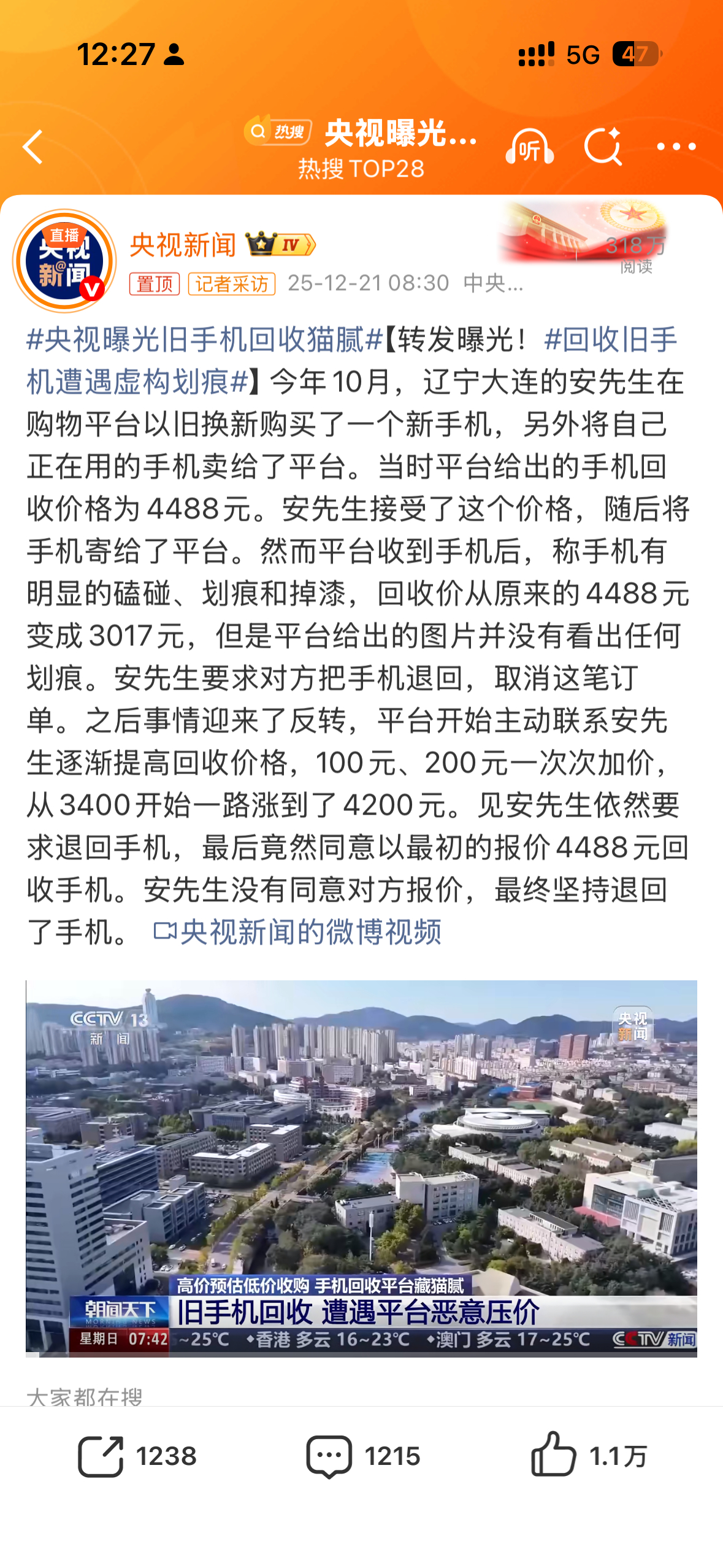 犀利观点+数据冲击央视曝光旧手机回收猫腻 旧手机回收就是一场精准割韭菜!高价预估低价收购成行业潜规则,黑猫投诉1.4万条相关投诉里,90%都是这类猫腻,一张模糊质检图就能砍掉近千元。更惊悚的是简单清数据等于裸奔,隐私被明码标价倒卖,诈骗、盗刷全找上门,谁还敢随便卖旧手机?!手机