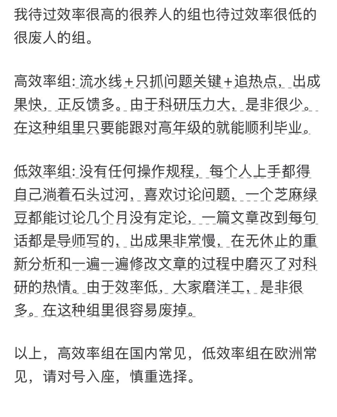 低效率组:没有任何操作规程,每个人上手都得自己淌着石头过河,喜欢讨论问题,一个芝麻绿豆都能讨论几个月没有定论,一篇文章改到每句话都是导师写的,出成果非常慢,在无休止的重新分析和一遍一遍修改文章的过程中磨灭了对科研的热情。由于效率低,太家磨洋工,是非很多。在这种组里很容易废掉。