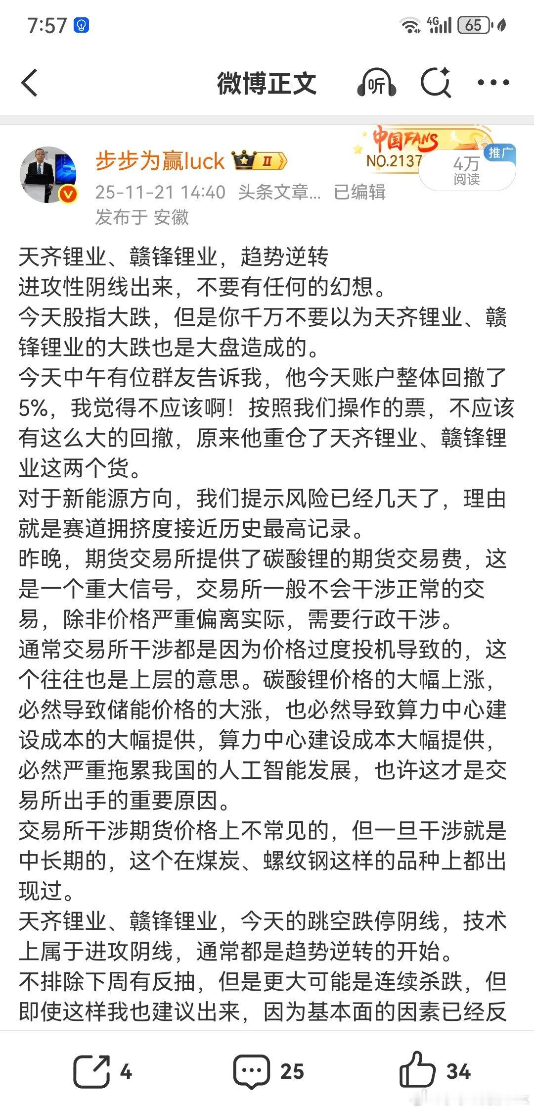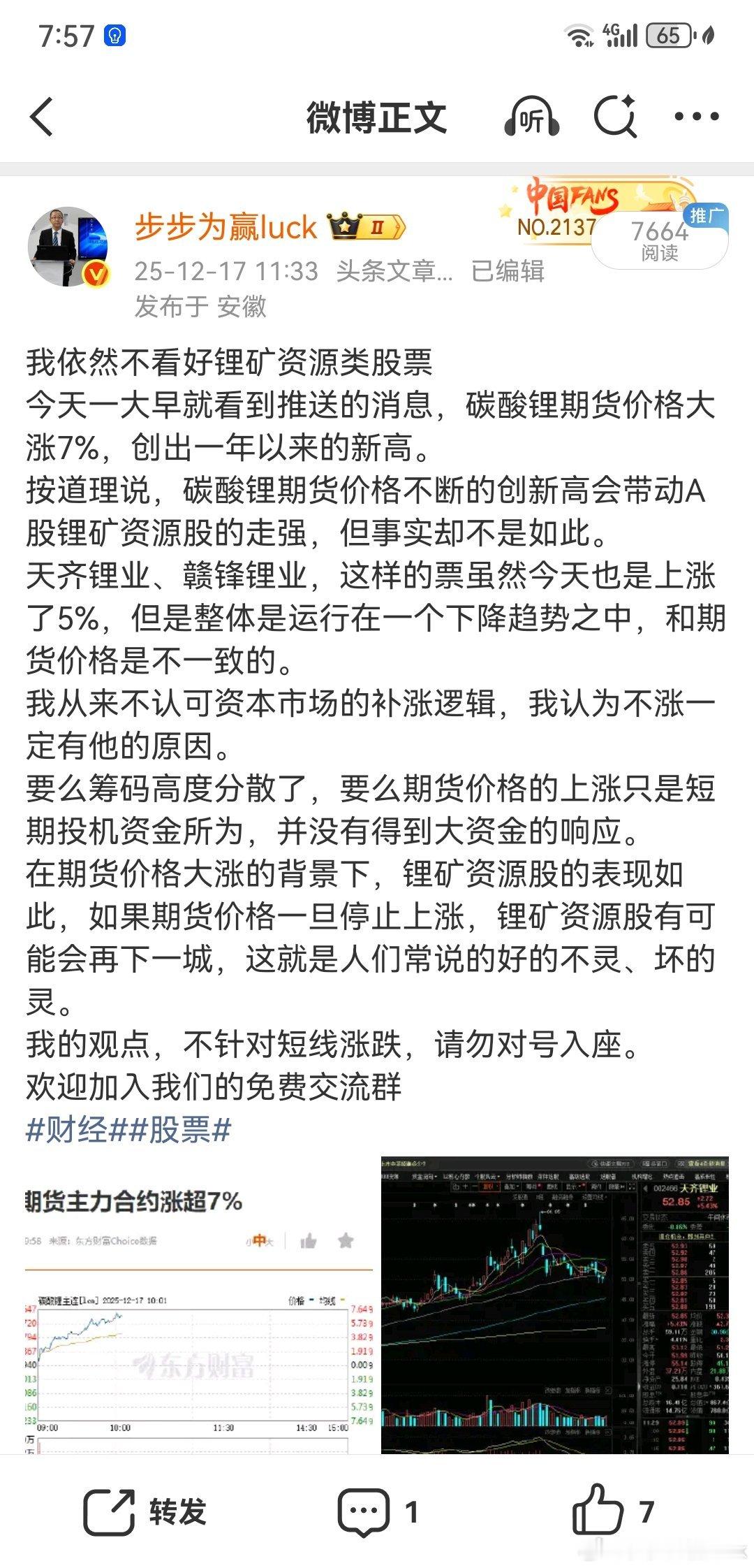 12月19日晚上广州期货交易所,再度发布对碳酸锂期货合约的限制。11月21日,我发表了天齐锂业、赣锋锂业,趋势逆转的文章。12月17日,在碳酸锂期货大涨的背景下,我发表了突然不看好锂矿资源股的文章。持续不看后期的根本原因,就是政策面的调控,不允许碳酸锂价格的大幅上涨,侵蚀上游产业链的生存空间。我们并不是锂矿资源的大国,原材料的大幅涨价我们不是受益方,不要拿过去的六十万一吨的价格去比,认为十万一吨很便宜。没有任何一个东西是完全市场化的,这是交易所第三次干预了,要对政策有敬畏之心,真正有定价权的是政府。财经股票