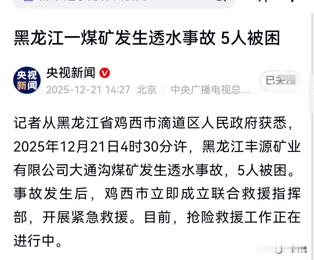 不好了不好了,这真是太令人担心了。 12月21日4:30许,黑龙江一煤矿发生透水事故,截至21日14:27,仍有5人被困。 目前抢险救援工作正在进行中。 希望这些人安全无恙。 一定要有奇迹发生啊。 毕竟都是家里的顶梁柱啊。 煤矿确实容易发生事故,真是防不胜防啊。