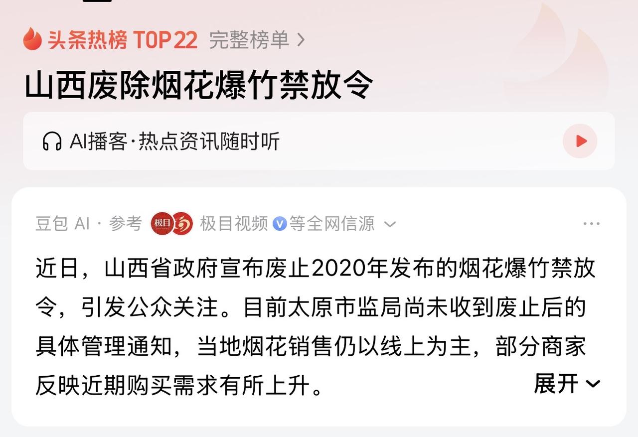 都说“北方保守,南方开放”,可是没想到全国第一个废除烟花爆竹禁放令得竟然是“山河四省”的山西省,这是一个好的现象,全国多数地区都有烟花爆竹禁放,有的地区甚至一刀切,所有地区兜禁放是不好的,烟花爆竹不是什么牛鬼蛇神,不是什么恶魔,不应该完全禁放,而是应该科学化制订燃放标准,设置一些燃放区允许市民在节假日燃放烟花爆竹,实在不能允许个人燃放的,可以由政府部门组织烟花秀活动让大家感受一些节日氛围。