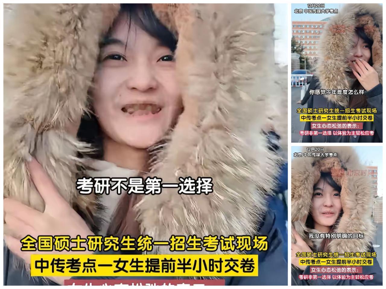 这心态真好!“考研纯体验?这女生的松弛感,才是反内卷的顶配!” 北京考点里,提前半小时交卷还全程带笑的女生,狠狠戳破了考研圈的畸形执念——太多人把这场考试当成背水一战的“人生判决书”,她却偏偏活成了“体验派玩家”。 388万考生挤破头抢名额,推免生占比年年涨,有人住寄宿机构熬到凌晨,把考试结果和自我价值焊死,仿佛考不上人生就彻底塌方,越拼越焦虑,越焦虑越陷死胡同。 但这女生的清醒才最戳人:考试从来不是身份标签,更不配成为定义成败的唯一标尺。那些质疑她“有后路才敢放松”的声音,其实掉进了思维陷阱——好像只有孤注一掷才叫努力,留有余地就是敷衍。 可真正的底气从不是“必须赢”,而是笃定就算这条路走不通,人生还有无数赛道能开出花来。考研热三连降的趋势早说明,年轻人正在挣脱“唯学历”的枷锁,不再把未来押注在一场考试上。 心态松≠不努力,而是不被结果绑架。在处处内卷的当下,这种“尽人事、顺天命”的通透,比死磕到底的蛮劲更显智慧。你觉得考研该孤注一掷,还是留一份平常心?来评论区聊聊~