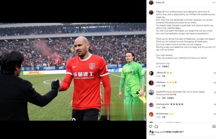 直播吧12月21日讯今日,成都蓉城外援费利佩更新社媒,告别此前已经离任的主教练徐正源。他晒出和徐正源在场边的握手照,并配文写道: