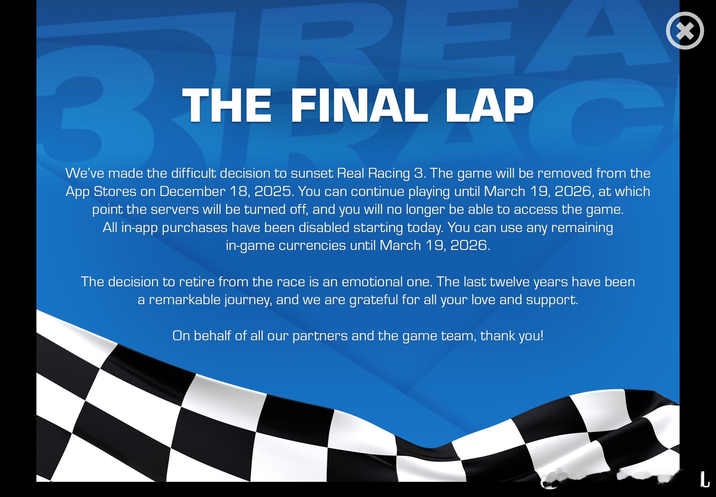 真实赛车3停服手游经典我记得当时买苹果有一部分原因是因为真实赛车3没想到好久不玩儿之后刷到停服了在App store 新用户确实没法下载了但原来下过的 还可以更新。更新之后和之前不一样了多了很多赛道 很多车但也没办法了享受最后的时光吧。