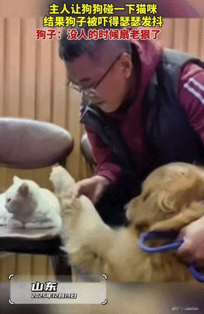 笑不活了!山东,主人带着狗狗去朋友家做客,刚好他家养了一只猫。主人见狗狗一直瞅着猫咪,然后心血来潮想让狗狗摸一下猫咪。但是谁也没有想到狗狗竟然不敢,主人拽着它的爪子让摸也不敢。网友这是全网最怂的狗了! 男子带着自己的金毛去朋友家做客,因为都说猫狗不合,他们也很好奇是不是这个样。其实他家狗狗到了朋友家后,很拘束,但是唯独看到猫咪后露出了笑脸,也许这是它们动物界的人情世故。 它一直瞅着猫咪,但是猫咪却表现的很淡定,理都不理它,猫咪心想:你个山炮,来我家干嘛,来就算了也不知道给我带个礼物,我才不想理你。 这时主人看出了狗狗的想法,问它:你是不是怕它,还想跟它玩。狗狗听后就只是低下了头,好像是默认了主人的意思。后来主人决定让狗狗去摸一下猫咪去,因为别看他家狗狗个子挺大,胆子并不大。 于是主人抱着狗狗告诉它:让他摸一下猫咪,还自己亲自做示范让它看。可是胆小的狗狗一直撅着屁股往后退,就是不敢摸。就算主人拉着它的手拽着它的手,它也不让摸。 真是让人哭笑不得,现在这个年头还有如此老实的狗狗吗?真是少见,这狗狗太可爱了。那么我也有个迷惑的问题:这么大体型的狗狗为什么怕比它小很多的猫咪呢! 对于这件事情,大家有什么看法? 信息来源:普陀潮