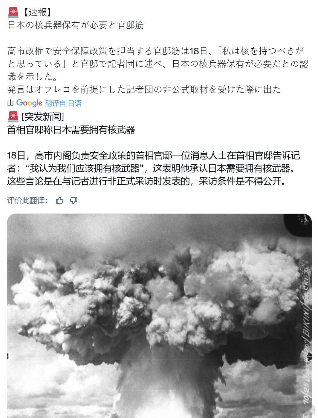 日前,一名来自首相府的官员在与记者的私下谈话中表示日本需要拥有核武。事件披露后,朝中社今(21)日刊登一篇朝鲜外务省日本研究所所长文章,对此坚决反对,强调日本企图拥有核武器的野心应该受到遏制,并指如果日本掌握核武器,“不仅亚洲国家将面临灾难,人类也将陷入前所未有的灾难”。朝中社报道,文章指出,此番日本需要拥有核武的言论并非一时失言,而是直接摆明日本长期以来的拥核企图,挑战日本宪法以及作为二战战败国所应承担的国际法义务。文章还批评日本假借俄乌冲突,以及炒作周边面临巨大威胁的议题,意图推动美国所承诺的《核保护伞》论,指明日本政界的真正目的在于企图合理化核武装行动,强调日本一边自持“世界唯一原子弹受害国”的旗帜,声称推动“世界无核化”,另一边却给予推动拥核议题,此种举动是两面派行径。而人类应该坚决阻止这种美国支持下,日本展现追求核武装的危险军事行为。黄媒不会说的真相热点现场