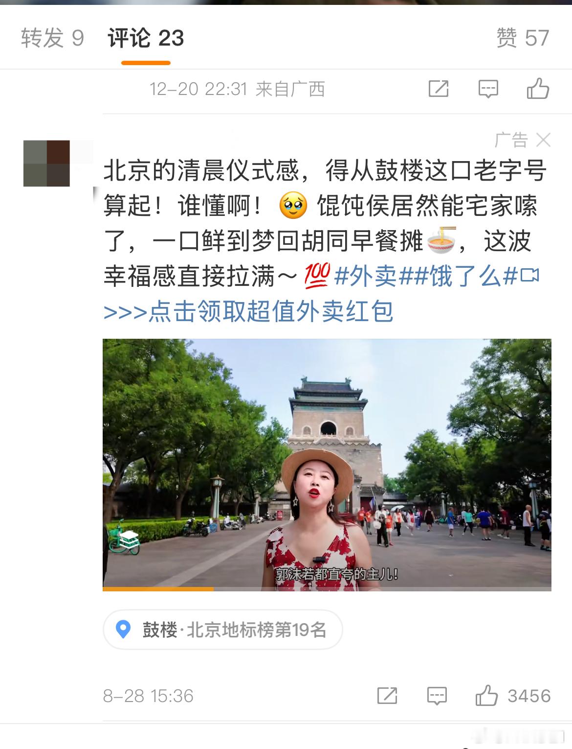 在评论区里看到这个广告,我完全不针对po主和饿了么,我就想说一句,鼓楼那儿这家馄饨侯不好吃,或者说馄饨侯普遍就……游客向的店,说得很清楚了吧……来北京旅游的朋友别抱着“哎我尝尝北京人民的日常馆子”去试这家,我们才不吃这家呢,几百米外老北京麦当劳比它香多了,还有汉堡神偷塑像可以打卡…… 北京·鼓楼大街