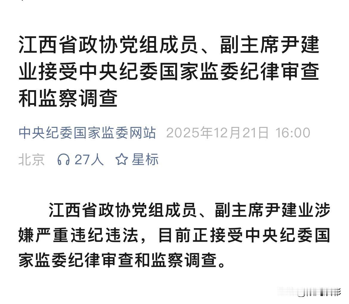 最新消息 江西省政协副主席伊建业被查,正在接受国家纪委审查和调查。 真是打虎不
