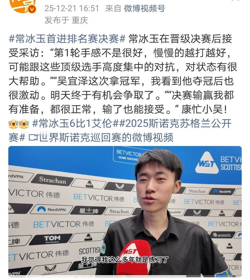 韦克林、常冰玉两人晋级苏格兰公开赛决赛后都说了什么?你能听出他们之间的差别吗?谁的心态更好? 韦克林:决赛我会全力以赴并展现出侵略性,如果不能取胜我也会欣然接受。 常冰玉:决赛输赢我都有准备,都很正常,输了也能接受。