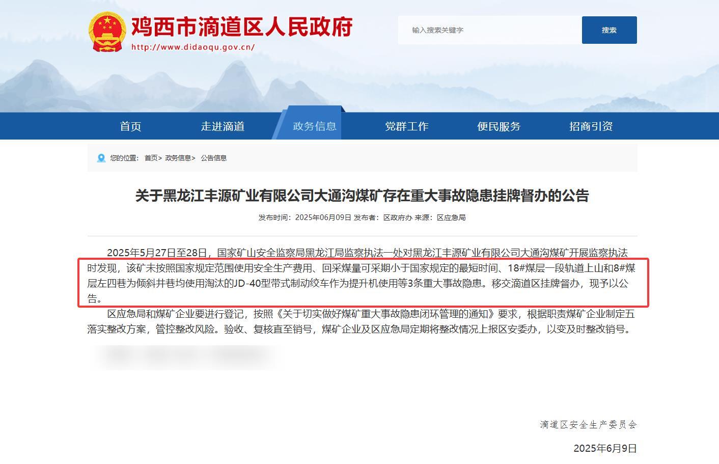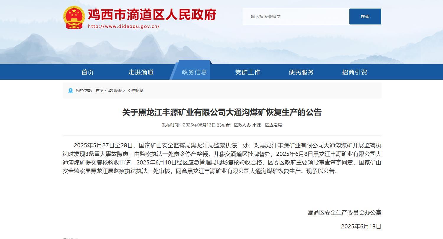6月9日,滴道区安全生产委员会发布《关于黑龙江丰源矿业有限公司大通沟煤矿存在重大事故隐患挂牌督办的公告》。2025年6月10日,经区应急管理局现场复核验收合格,区委区政府主要领导审查签字同意,国家矿山安全监察局黑龙江局监察执法一处审核,同意黑龙江丰源矿业有限公司大通沟煤矿恢复生产。