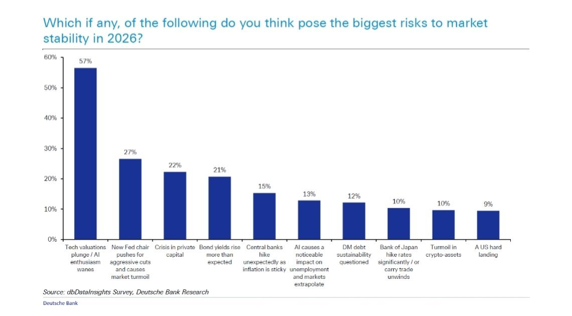 德银调查显示,人工智能/技术泡沫被视为最大的风险,其次是美联储独立性丧失和私人信贷危机。