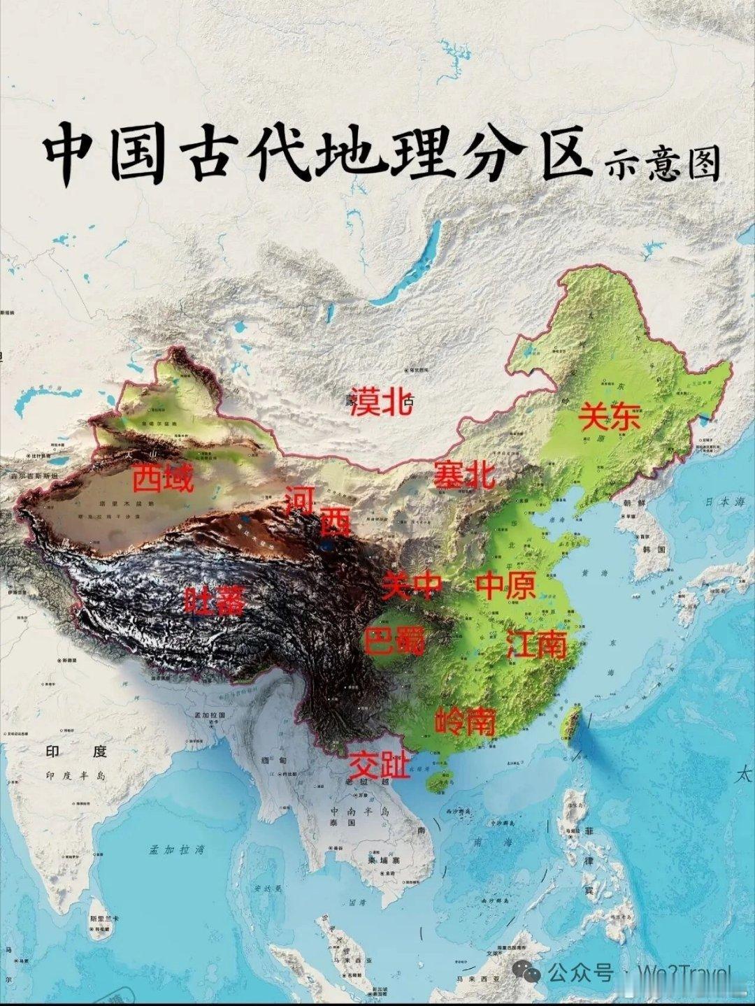 中国古代地理分区中原:黄河中下游地区。关中:陕西中部地区。河西:黄河上游,甘肃地区。西域:新疆和中亚部分地区,塞北:长城以北,内蒙古地区。漠北:外蒙古地区。关东:山海关以北,东北地区。江南:长江中下游地区。巴蜀:四川盆地。吐蕃:青藏高原。岭南:广东广西福建海南。交趾:东南亚地区。
