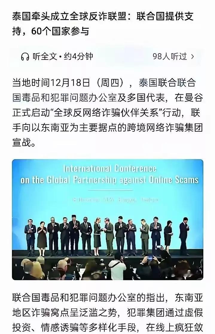 泰国在12月18日搞的这个全球反诈联盟,非常的高明,说明它的背后有高人。 这个反诈联盟甚至还拉联合国帮它背书。 其目的只有一个:为泰国的军事行动披上正义的外衣。 这样面子有了,打击电诈是正义; 里子也有了,借机夺取了更大的领土。 柬埔寨既输人又输地,得不到同情。 如果泰国穷追猛打,不死不休,柬埔寨内阁执政很有可能出现危机。 打击电诈的终极手段还是炸掉电诈园区,泰国己经炸掉了六个柬埔寨电诈园。泰国只要拉起反诈旗帜,它就可以放手干!