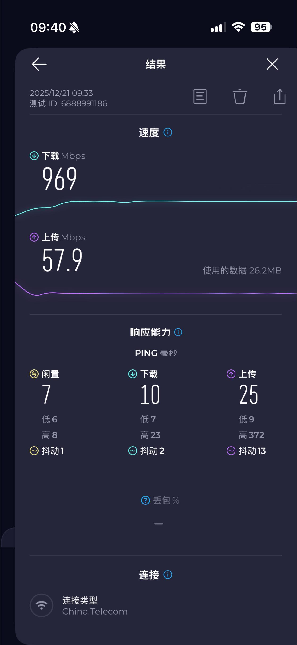 朋友们早上好呀!一早起来搬家,把宽带先搞定,替换掉原房主自带的300M移动宽带,换上了我自己的电信千兆宽带,测了一下速度,发现挺有意思移动300M实际可以跑到362Mbps,电信1000M下载969Mbps,整体还是属于正常范围,上传速度倒是大差不差,问了一下师傅,默认就是50Mbps,想要提升到100,要加200块钱,性价比太低了