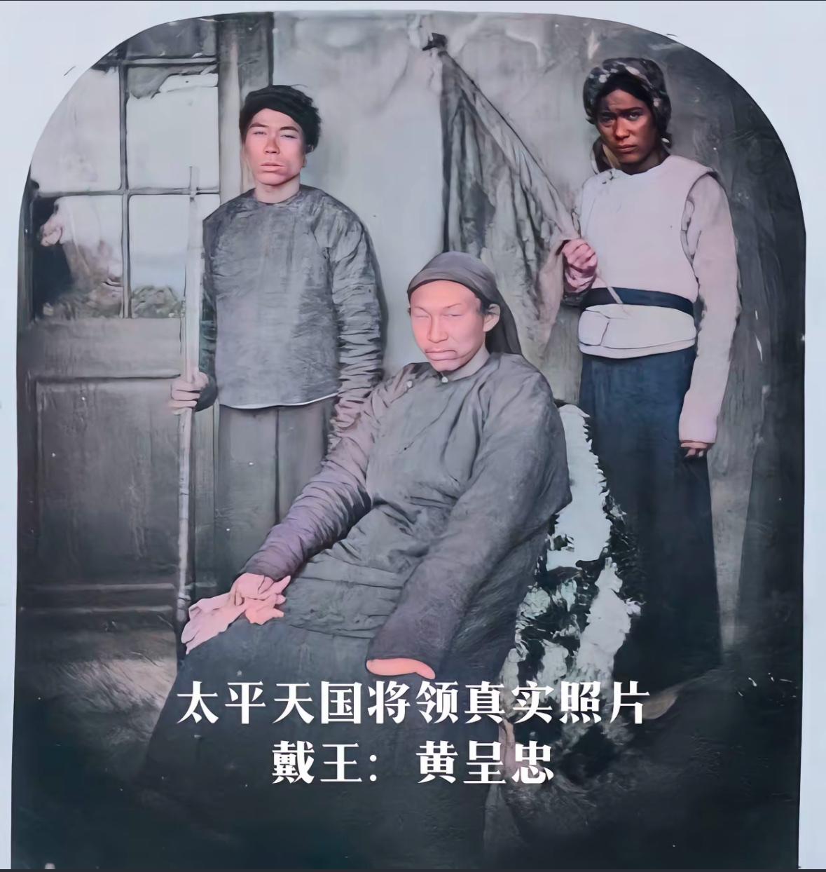 这是1862年,太平天国“戴王”黄呈忠端坐在虎皮椅子上的照片,他头戴方巾,下巴有刀伤,左眼疑似半瞎,经过历次战阵,黄呈忠的左胳膊已经没有了,右手缺少几根手指,他的棉袍袖口是黄色的,当时他身为“宝天义”,虽然不能穿龙袍,但是里面的褥子可以是黄色。身后站着两个太平随员,左边的侍卫兵手持武器,表情萧穆,右侧则以为女兵,外套马甲,系一条腰带,左手持一面旗子,应该是黄呈忠的旗手或传令兵,好不威风。这张照片是1862年,在浙江杭州由传教士乔治特拍摄的,记录了黄呈忠在浙江杭州宁波一带的活动。 1843年,太平天国横空出世,18岁黄呈忠勇气满满,智谋过人,跟着太平天国军一打一个胜仗,被天王洪秀全封为“戴王”。别看他左手残废,但眼神真的狠…满眼戾气摄人心魄。 1861年宁波之战,他采取了声东击西的策略 ,迷惑了清军和盘踞在宁波的外国势力,最终以迅雷不及掩耳之势攻占了宁波。宁波的沦陷令西方列强惊诧不已,因唯恐太平军妨碍在其他华商业活动,他们遂介入这场冲突。 1862年秋,他与忠王李秀成并肩作战,进攻上海,在青浦附近遭遇与李鸿章的淮军国外国洋枪。此战充分展现黄呈忠的军事指挥才能和太平军的战斗力,他巧妙地运用战术,把太平军的特长发挥到极致。数小时血战,太平军大获全胜,洋枪队伤亡800余人,淮军阵亡600名,洋枪队领头华尔身中五枪,次日不治身亡。 青浦之战的胜利,使黄呈忠声名鹊起,成为太平天国后期一位杰出的将领,自此他被封为“戴王”。 因此,这张老照片的价值,不在于其作为历史肖像的缺席性,更在于它所引发的历史沉思。它让我们看到,“在太平天国”这个宏大的历史标签之下,是一个个如黄呈忠这般有血有肉,有起有伏的个体生命。他们的野心,勇武,获得权位与面临困境,共同编织了那段复杂的历史。