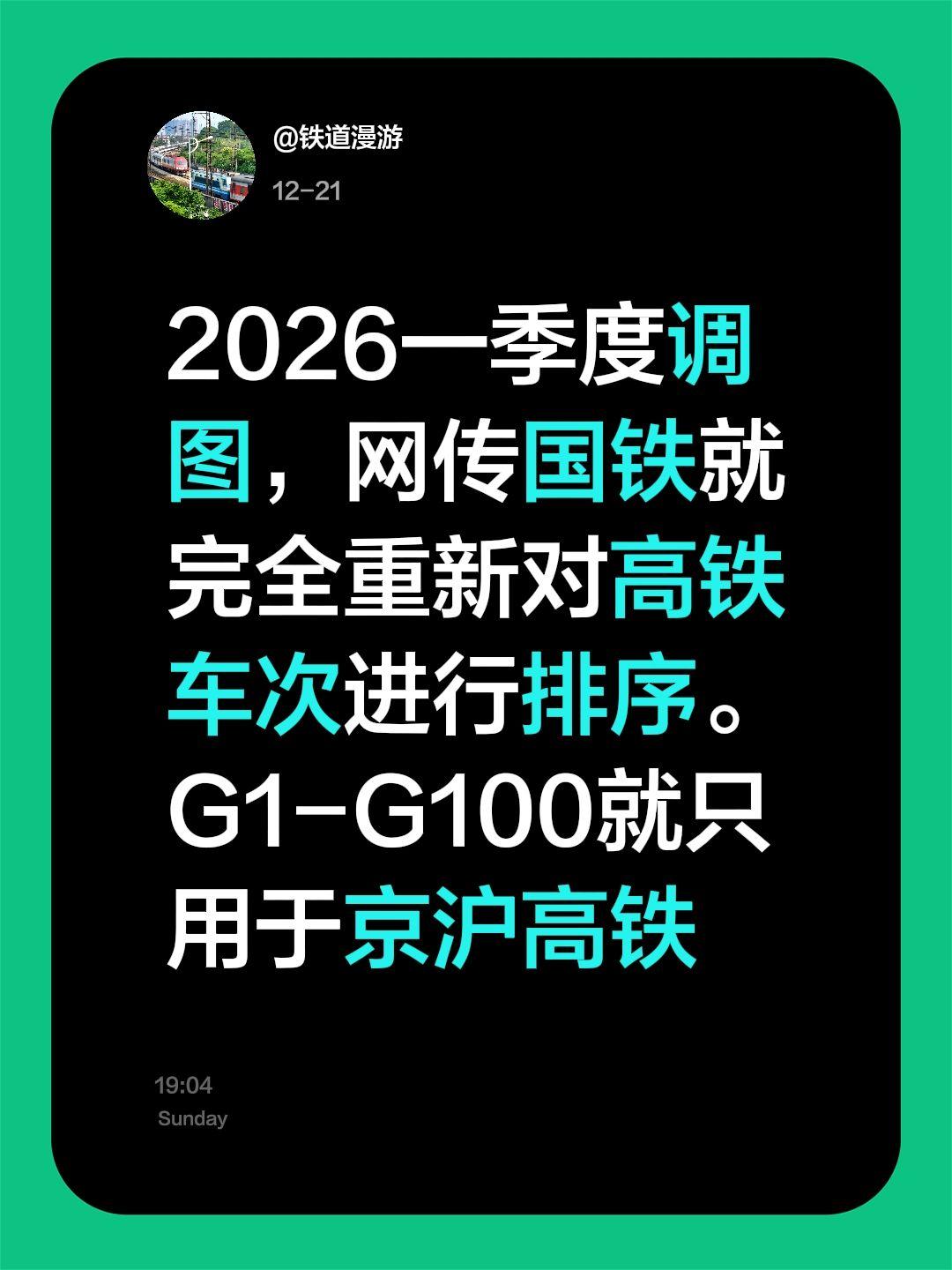 2026一季度调图,网传国铁就完全重新对高铁车次进行排序。G1-G100就只用于京沪高铁