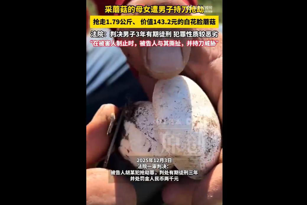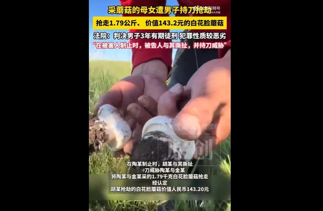 内蒙古男子胡某在草场旁抢走一对母女价值143.2元的蘑菇,被害人制止时遭其撕扯并持刀威胁。 法院认定其犯罪性质恶劣,以抢劫罪判处其有期徒刑三年,并处罚金两千元。 这男的简直是脑子进水了,嚣张到没边! 为了一百多块钱的蘑菇,就敢光天化日拦截一对母女,不仅撕扯还持刀威胁,这哪里是抢蘑菇,分明是无视他人生命安全的恶性犯罪! 别觉得抢的钱少就不算大事,抢劫罪的核心是暴力胁迫,他的行为已经把受害者置于危险境地,性质恶劣到骨子里。 也许会有人觉得“判3年太重”了。 其实,这是对法律的无知! 因为《刑法》早就明确,抢劫罪不论数额大小,只要实施了暴力胁迫行为就构成犯罪,起步刑就是3年。 法院的判决一点不冤,恰恰是守住了法律底线,震慑那些想“小恶不惩”的亡命之徒。 更戳痛处的是这类犯罪背后的法治缺失:胡某大概率觉得“抢点蘑菇不算啥”,才敢如此肆无忌惮。 这事儿给所有人提了醒:法律不看你抢了多少钱,只看你犯了多大恶。 别心存侥幸触碰法律红线,哪怕是“小事”,只要突破了暴力伤害的底线,就必须付出沉重代价!