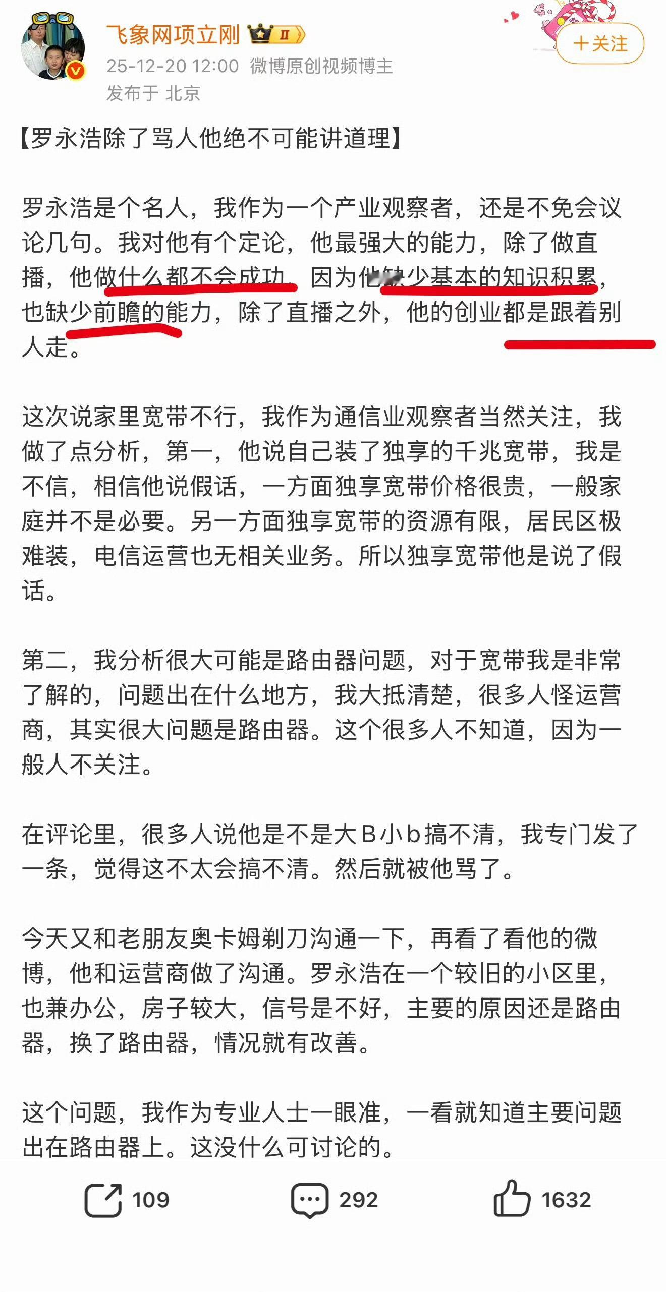 项立刚回应罗永浩谩骂 宽带维权变人身互撕!罗永浩怒喷项立刚“智障”,对方直接回怼“除直播外干啥都不成”,还列6大罪名要写MBA案例。本是千兆网速缩水的民生话题,转头变成大V互掐,项立刚强调行业洞察,罗永浩吐槽对方“精神病”,网友看得一脸懵:俩大佬忙着对线,普通用户宽带缩水的坑谁来管?这场骂战到底是观点碰撞还是流量炒作?罗永浩