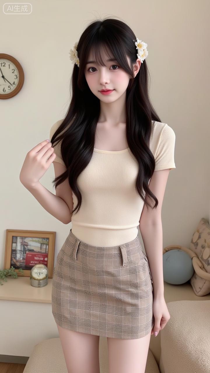 粉墙裹着软光,杏色吊带碰了格裙的甜,发夹沾了床榻的柔。连空气都浸着蓬松的暖。 卧