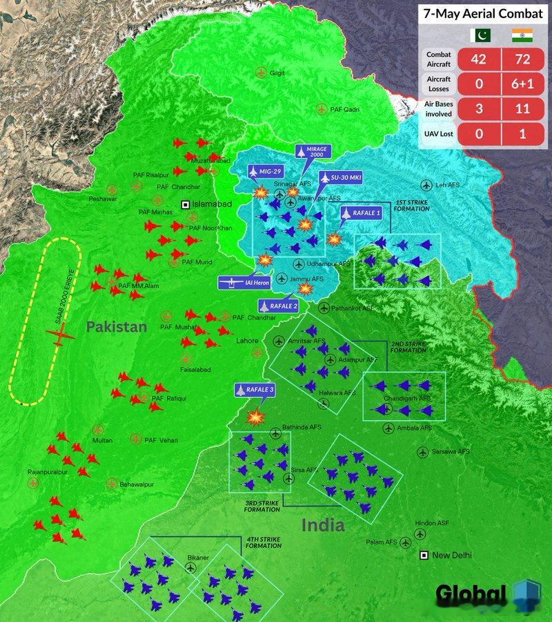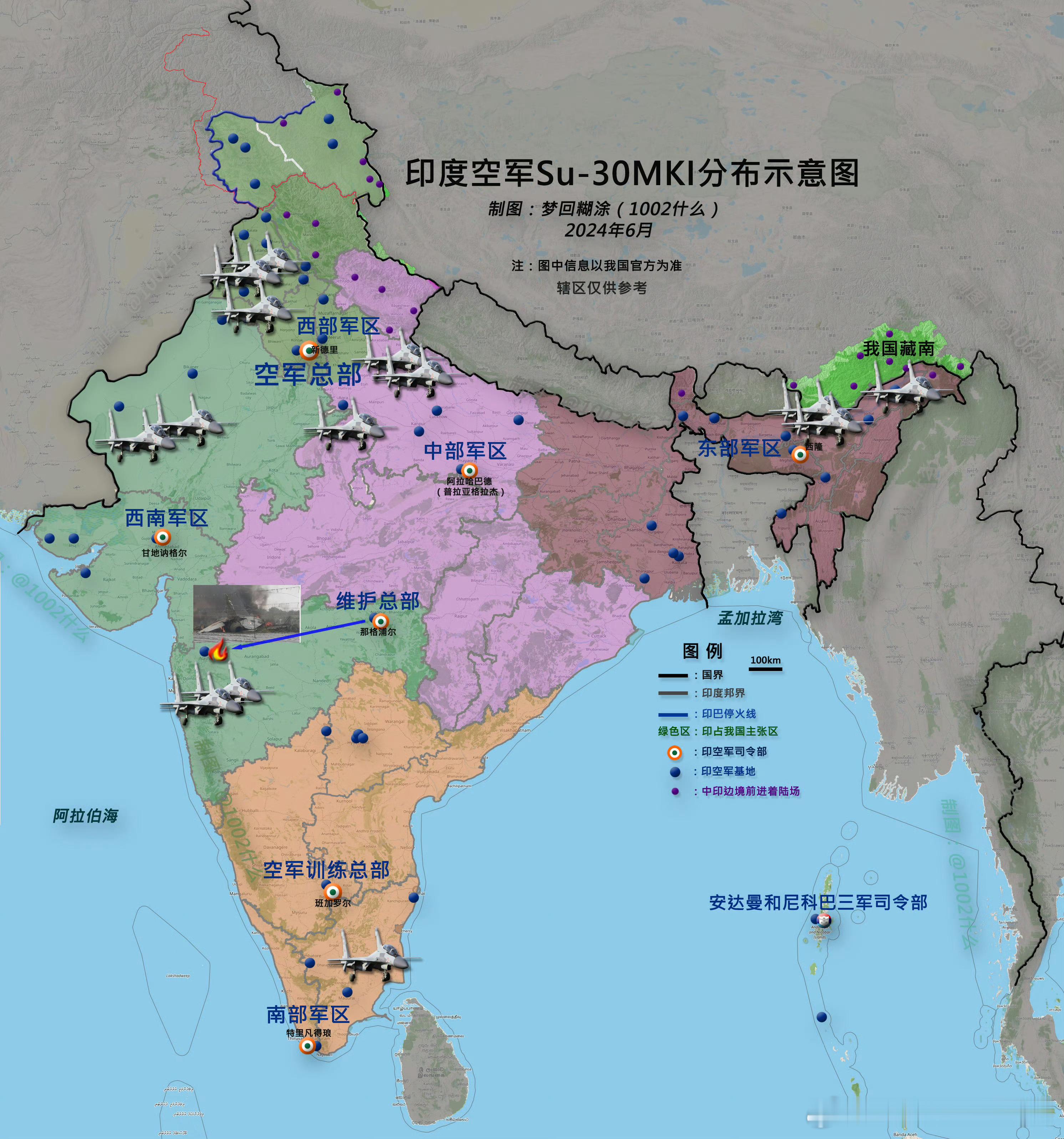 日耳曼赢学歼10c是怎么击杀印度阵风的 印度空军靠近中国边境的空军基地一览及空战实战结果➡️图1为阵风基地、图2为苏30MKI基地(图源:1002什么)、图3为印巴57空战战情示意图。阿三沿袭苏联军事理论、大量设置前线简易机场、虽然响应时间快、但被反击也快,大部分印度空军基地都在火箭炮和SRBM覆盖范围内。➡️印度空军目前只有32架左右阵风、268架左右苏30MKI、51架左右H2000能打仗,剩下的美洲虎米格27古董和不靠谱的42架左右LCA(含未安装发动机和HUD的4架)。根据2006年the north edge演习结果五代机对四代机普遍能做到单向透明打击、限制只是弹药有限。参考4X2计算,66架五代机足以消灭整个印度空军的主力,剩下的全是该进博物馆的古董。➡️阿三前线有大型工事的永备基地约11个、120~150枚左右DF打击油库、弹药库问题不大。可采用围点打援、用火箭炮点名企图修复空军基地的施工队。印巴57空战印度空军投入72架战机空战阶段耗时约1小时,消灭5.5倍阿三战机最多5~6个小时出结果,剩下的瘫痪苏30阵风维保中心可用高超音速导弹完成。⭐️结论:一场有限规模的外科手术空袭就能解决🇮🇳空军主力。