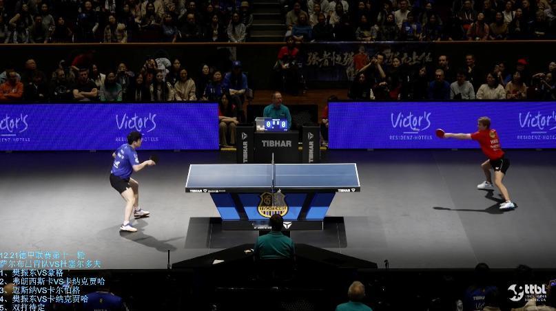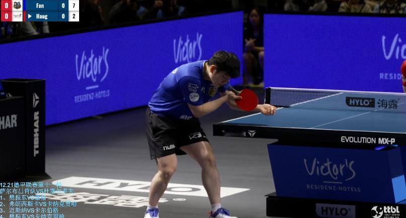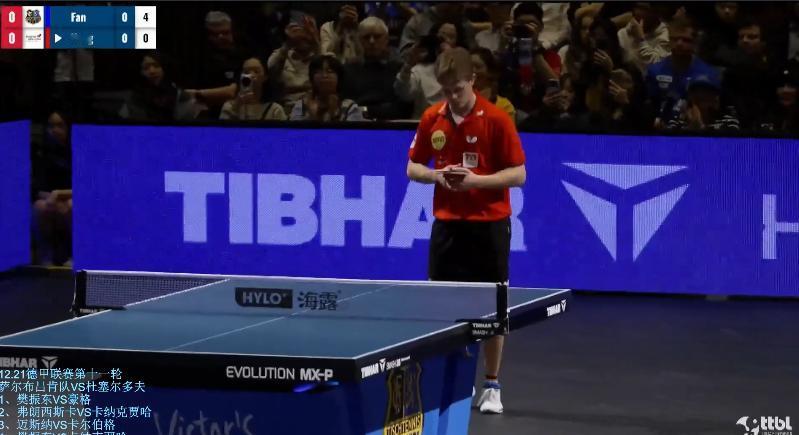 德甲快讯:樊振东对战豪格的比赛, 第一局 樊振东6:0开局, 两人差距太大了, 估计20分钟结束战斗。 哈哈,东哥放水了。 这么高的球不呼他。 东哥8:2领先。 怪了,估计方博又要骂人了, 东哥打的太快了 11:2拿下,哈哈, 两人实力差距太大。