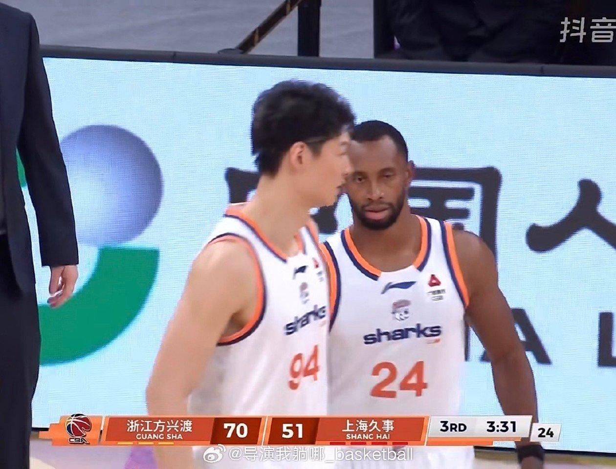 第三节结束还有3分半钟,上海已落后浙江19分,估计逆转没戏。 这哥俩就跟着折返跑了,没有任何战术,球衣虽湿,手却是凉的,因为都没怎么摸球……