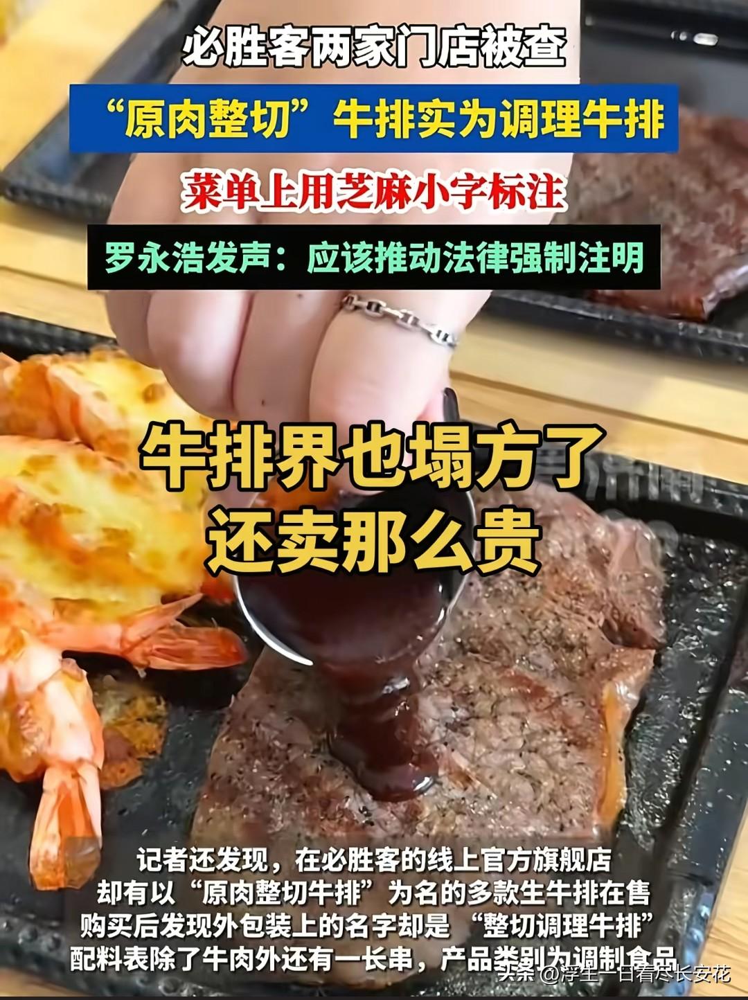 原来必胜客的牛排不是真牛排,而是调理牛排,也就是说我们看到的牛排不是从一头牛身上割下来的,而是把牛肉当成配料,再加点其他的配料混合成块,然后就有了含有牛肉的合成肉食品。 有人可能要问,要是真的用纯牛肉,普通人恐怕吃不起了!但问题就在于,普通人想吃的,而且宁愿花更多钱奢侈一把,目的就是想吃上正宗的牛排,而不是合成肉,更不是科技与狠活。 便宜没好货,好货走不了量,永远是一分钱一分货。大家怎么看呢?欢迎留言。