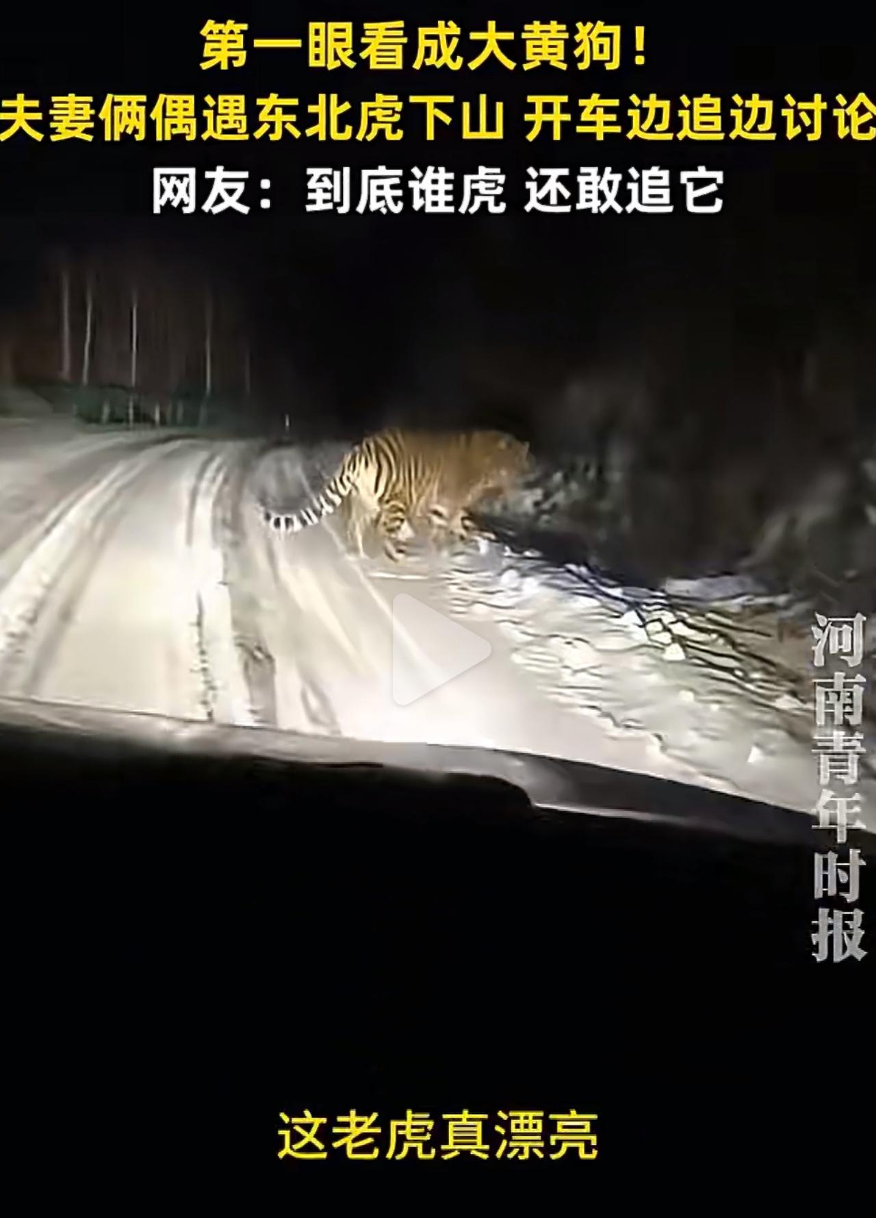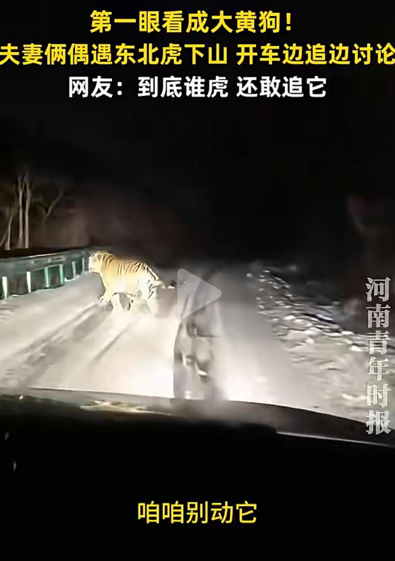 12月20日晚上,夫妻俩开车路过山路,远处晃悠的黄色身影被妻子一口咬定是大黄狗。可越靠近越觉得不对劲——那体型、那神态,哪是什么狗啊?等看清是东北虎时,两人非但没立刻踩油门逃跑,反而慢悠悠开车尾随,还掏出手机拍视频。这段视频传开后,网友直呼“到底谁更虎”,连专家都忍不住批评:这简直是拿生命开玩笑! 换做是普通人,撞见老虎早吓得魂飞魄散,这对夫妻的操作实在让人想不通。可细想下来,深夜光线差、老虎身影乍一看确实容易和大狗混淆,再加上近些年东北虎种群恢复,偶尔下山觅食成了常态,反倒让一些人放松了警惕。但再怎么说,野生东北虎是顶级猛兽,尾随观察的行为,跟玩命没啥两样。 有人笑他们心大,也有人担心这种没安全意识的做法迟早出事。东北虎下山,既证明生态保护有效果,也藏着人和动物抢地盘的麻烦。我觉得,碰上这事儿别光顾着新鲜,得存着敬畏心,赶紧躲远才对,哪能凑上去看热闹。 如今当地已经加强了巡逻和警示牌设置,只希望大家都能把安全放在心上,别再上演这种“认虎为狗”的惊险戏码了。通人性的大黄狗 路遇大狗 东北虎